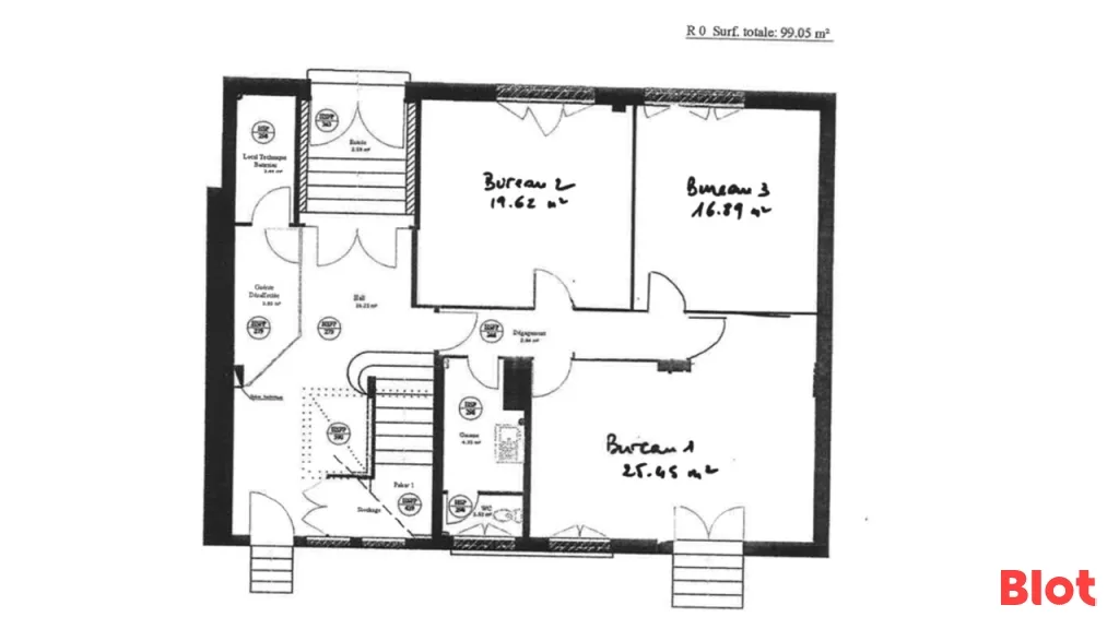 - A l'étage : 7 bureaux, 3 WC, 1 local technique.