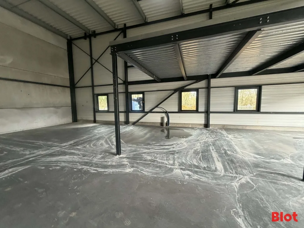 - Équipements : porte sectionnelle, porte d’accès piéton, châssis vitré