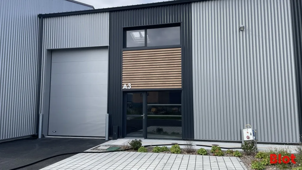 Showroom avec vitrine d'exposition, bureaux en mezzanine avec ouvertures en façade, atelier isolé avec une grande porte sectionnelle motorisée.