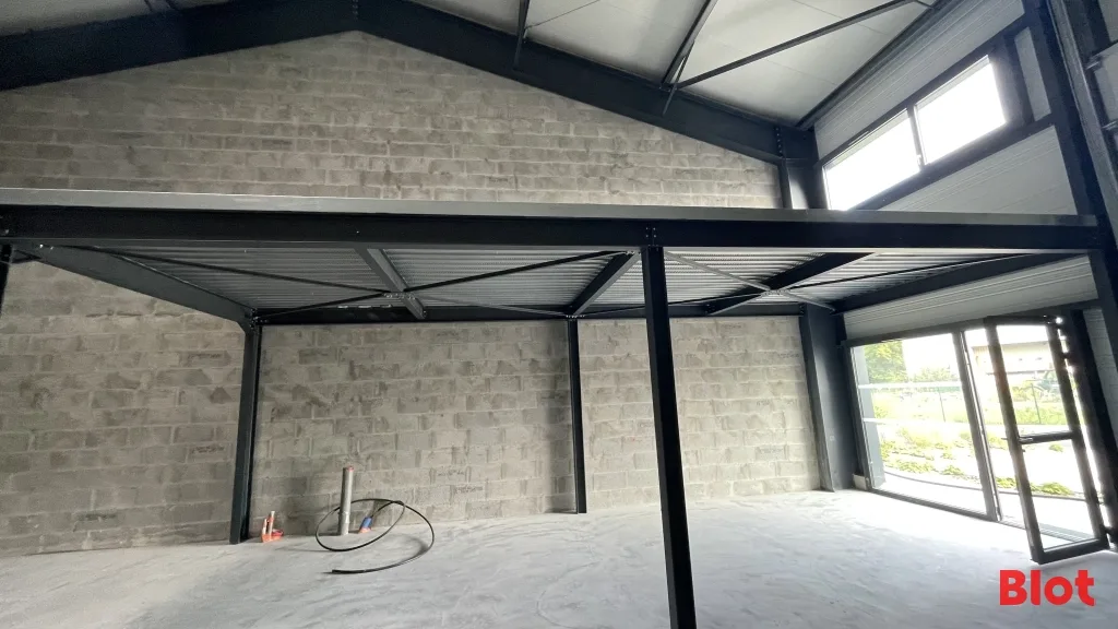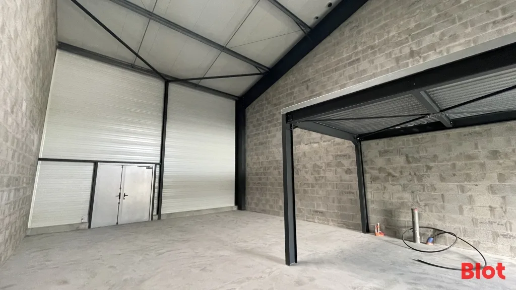 Showroom avec vitrine d'exposition, bureaux en mezzanine avec ouvertures en façade, atelier isolé avec une grande porte sectionnelle motorisée.