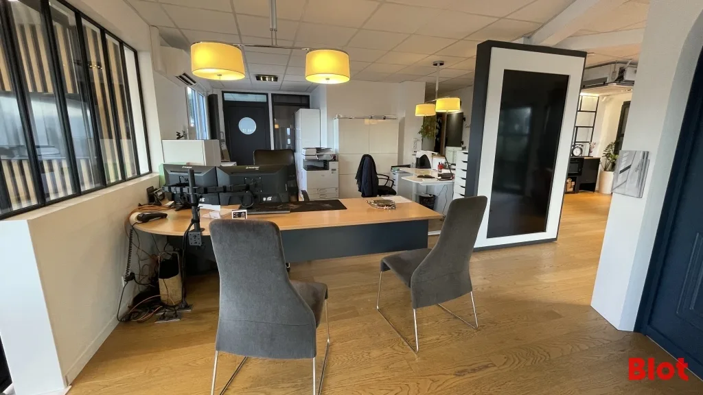 - A l’étage : 2 bureaux cloisonnés, une salle de réunion, cuisine, sanitaires (ou logement de fonction) d’environ 83 m²