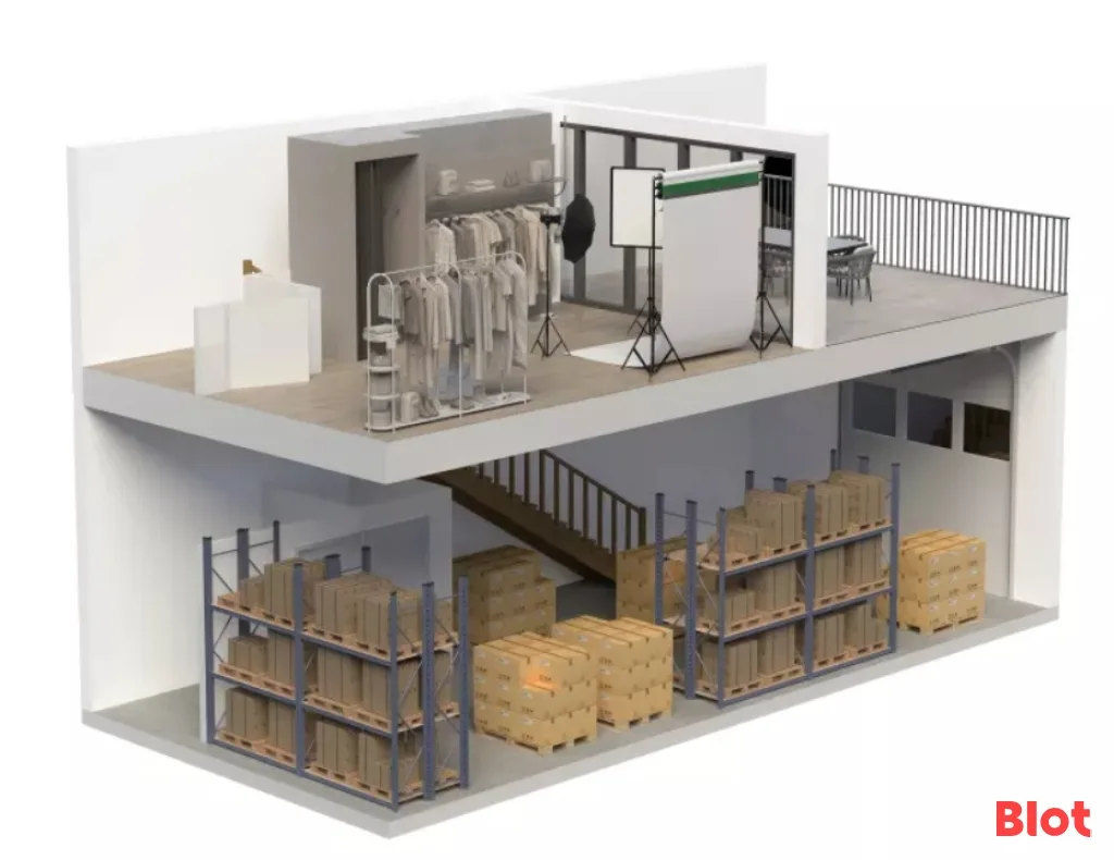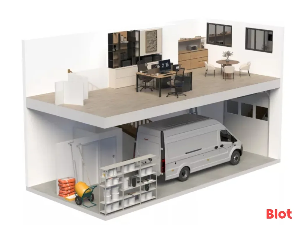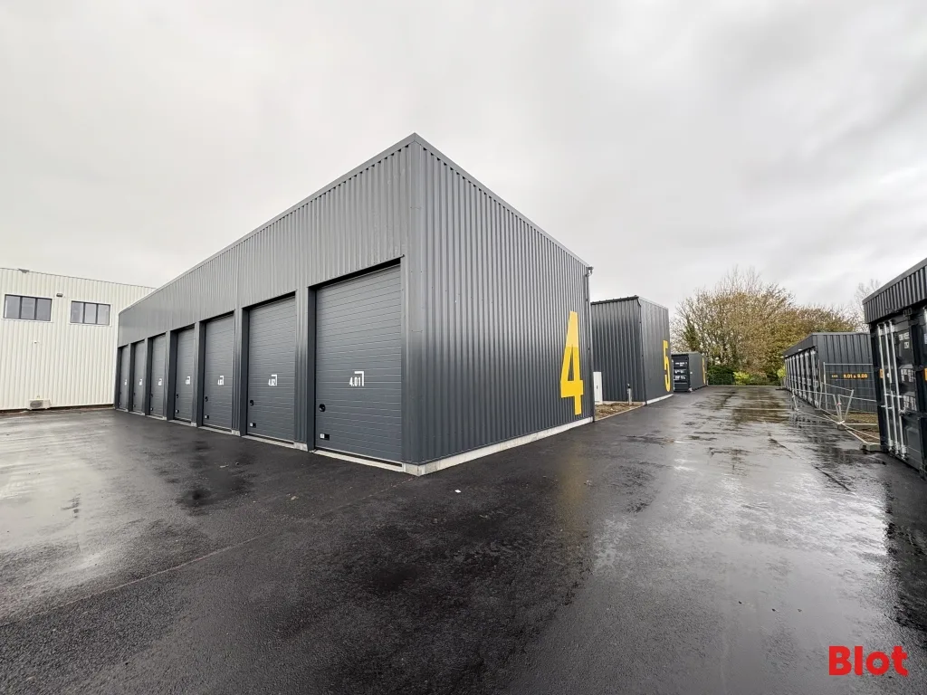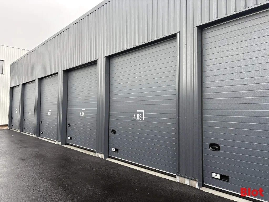 Surface utile : 48m² - Zone de stockage ou atelier- Éclairage, prises électriques, point d’eau - Porte sectionnelle motorisée (H 3,50 m x l 3,00 m) -Porte de service - Sanitaires privatif - Local technique