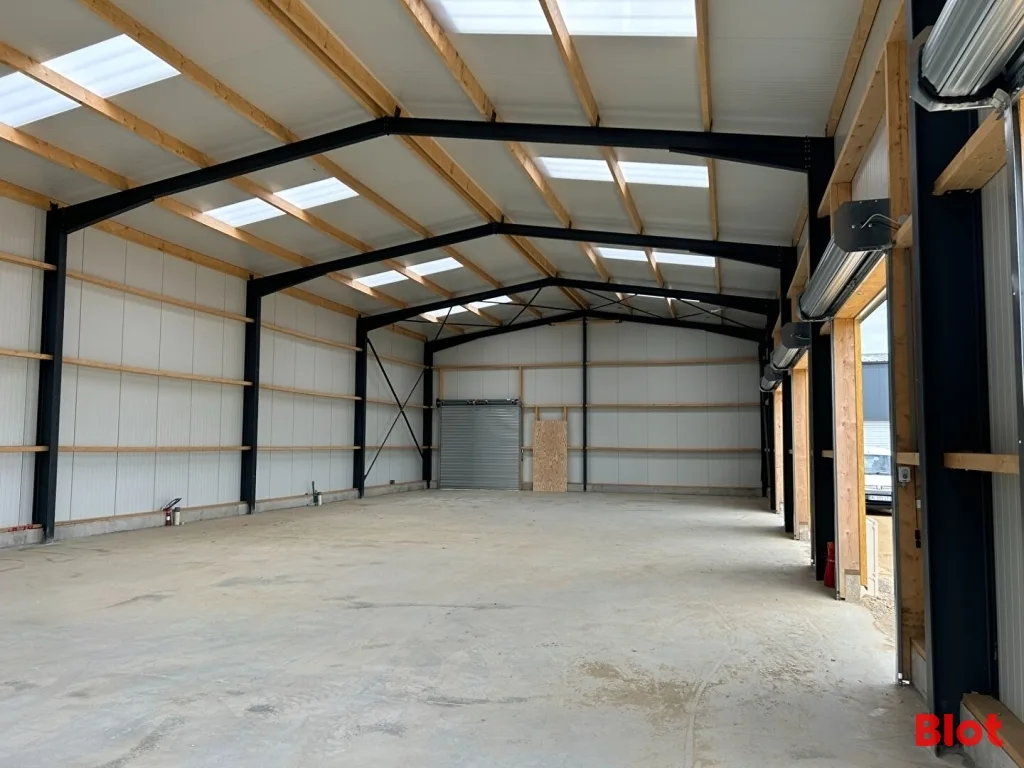 terrain de 1742 m² environ, parking aérien (1), locaux fibrés, couverture métallique, ossature métallique, bardage métallique double peau, isolation, porte sectionnelle avec rideau métallique électrique, terrain bitumé.