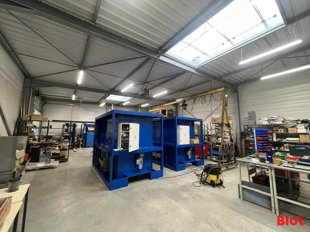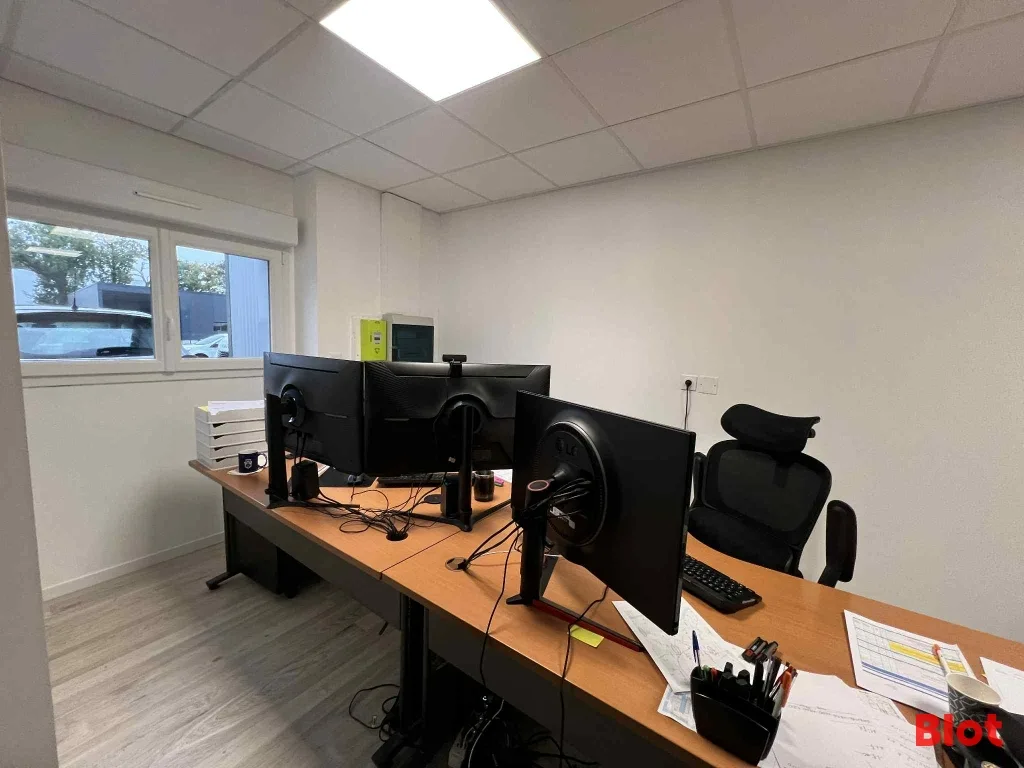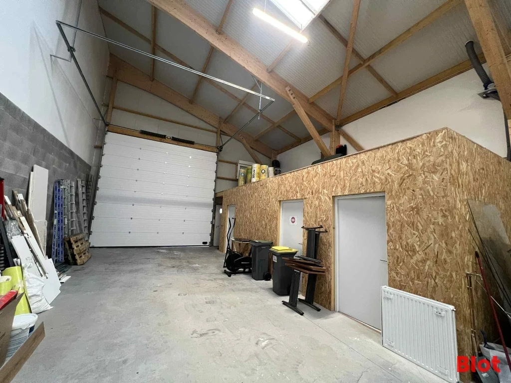 Ensemble immobilier neuf de 225 m², comprenant 30 m² de bureaux et locaux sociaux (2 bureaux + salle de pause) et 195 m² de stockage accessible par une porte sectionnelle (4m x 4m) avec belle hauteur de 9 m. 🏢