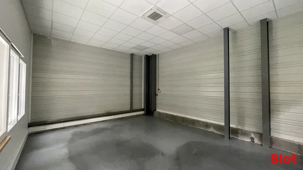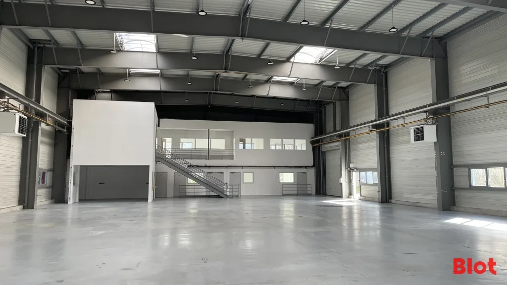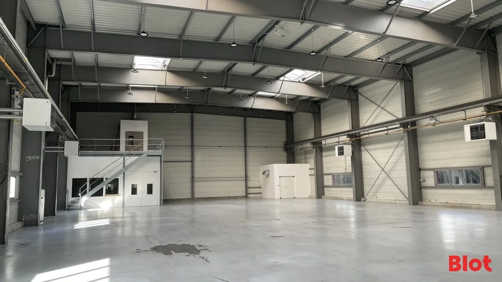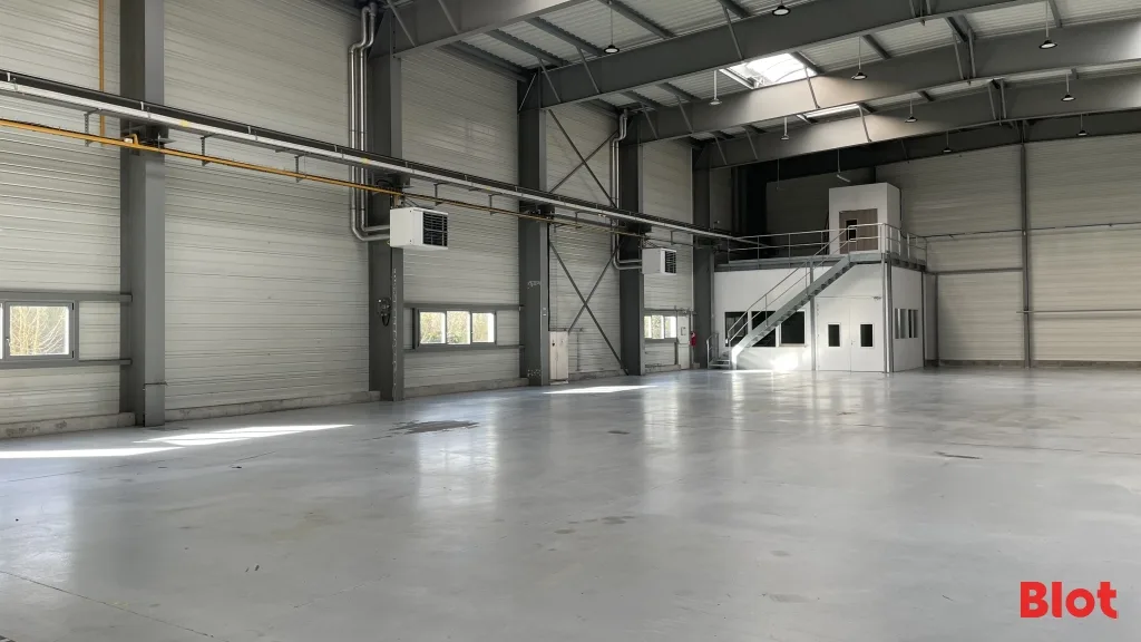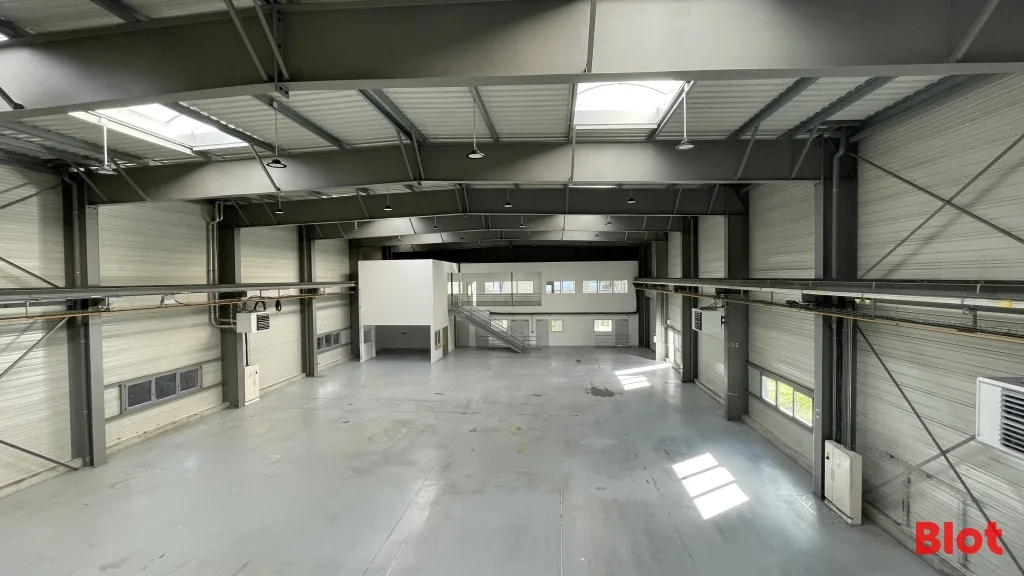 - 791 m² environ d'entrepôt avec belle hauteur chauffé par 4 aérothermes gaz, chemin de roulement pour pont, compresseur, triphasé, magasin et local technique.
