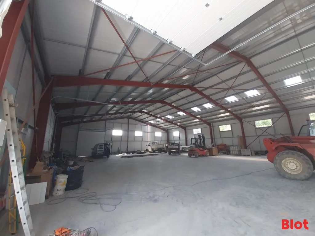8 parkings aériens, couverture en bac acier isolé, ossature et bardage métalliques, isolation double peau, 3 portes sectionnelles, terrain bitumé avec accès poids lourds.