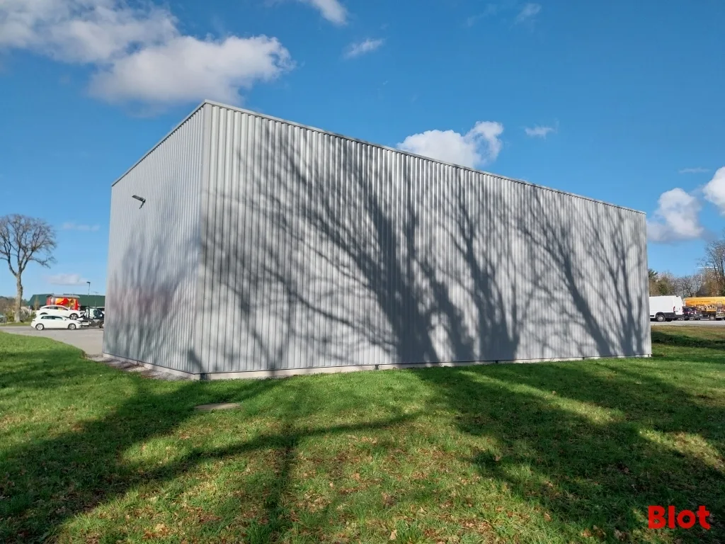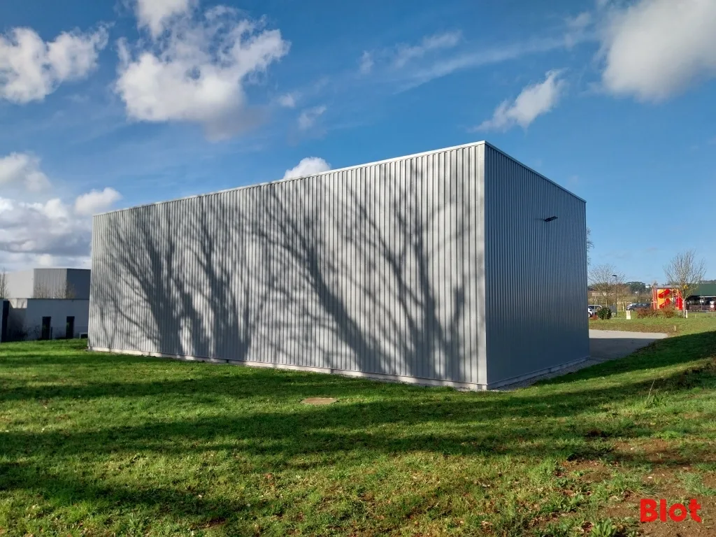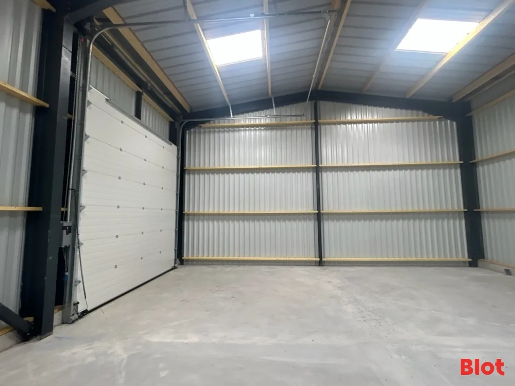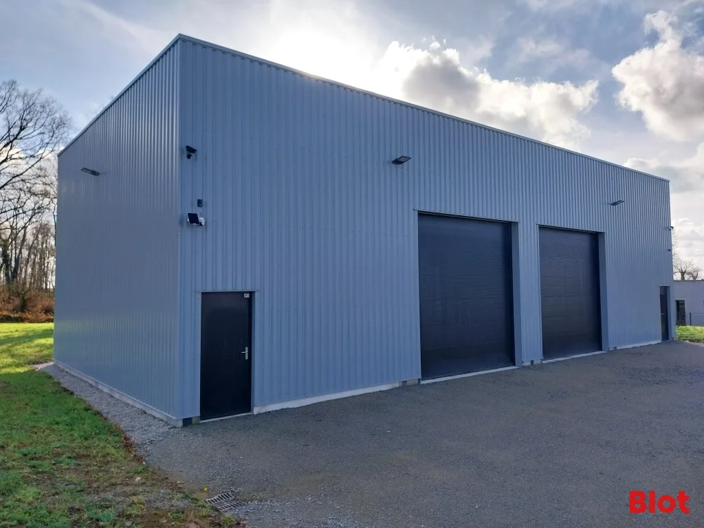 Le bâtiment dispose d'une ossature métallique et un bardage double peau avec une toiture en bac acier isolé. L'intérieur est actuellement livré brut de béton. Deux portes sectionnelles électriques et deux portes de service complètent l'ensemble.