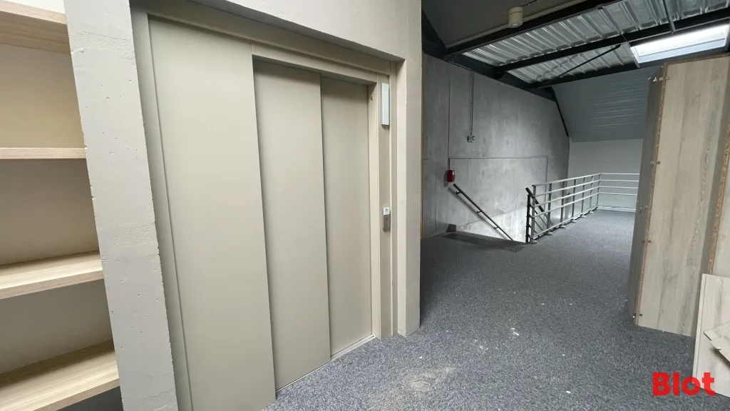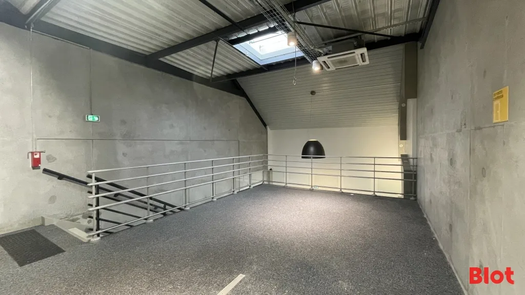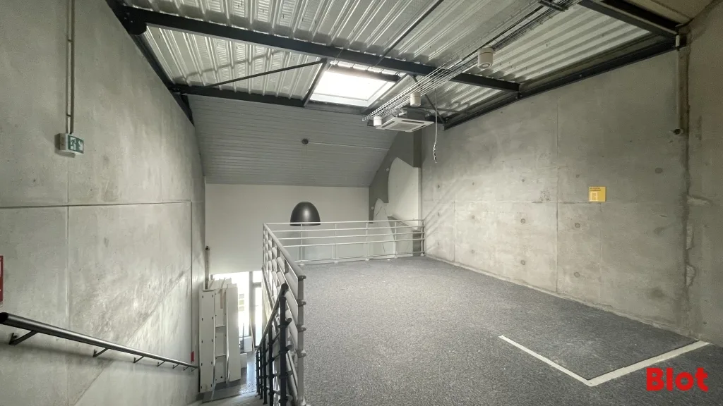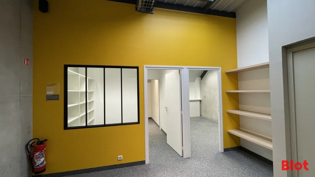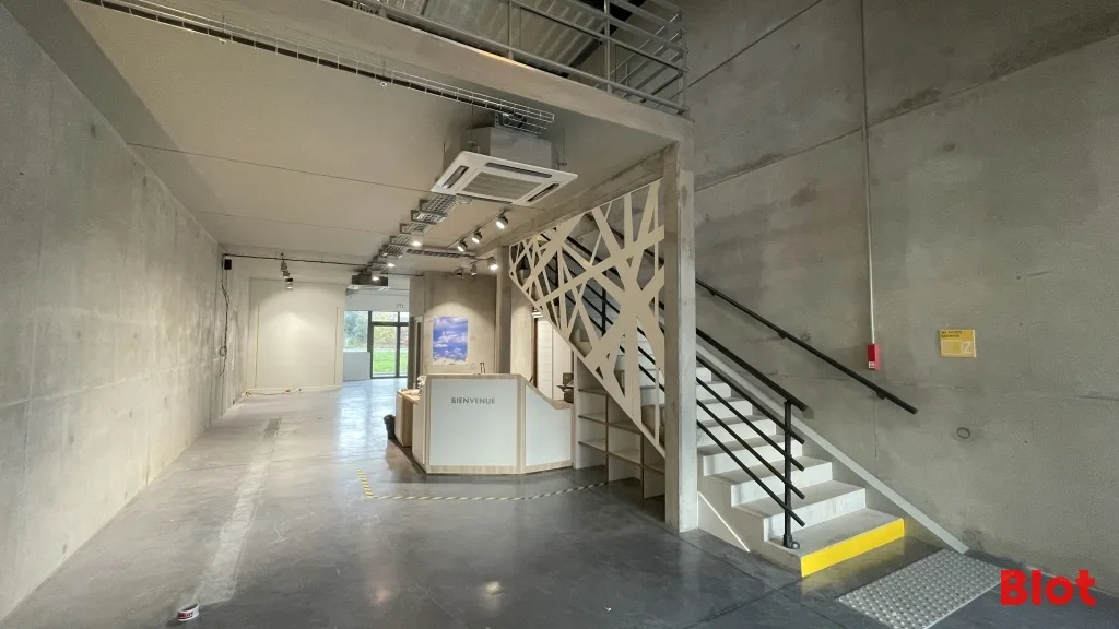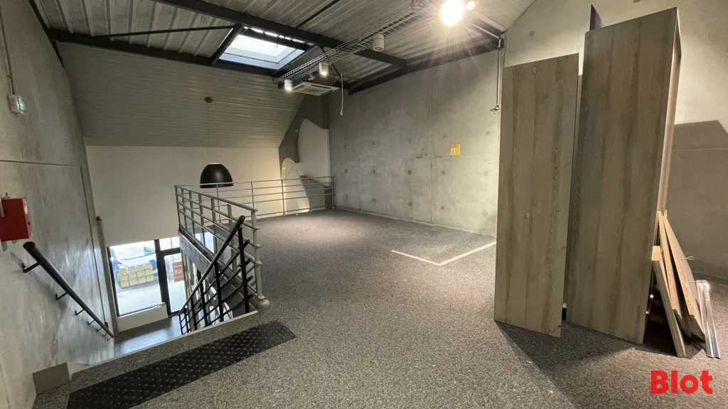 - Une surface de vente en rez-de-chaussée de 100 m² environ ; sol béton ciré, placards sous l’escalier intégrant le compteur électrique et la baie de brassage ; sanitaires PMR avec un placard ;