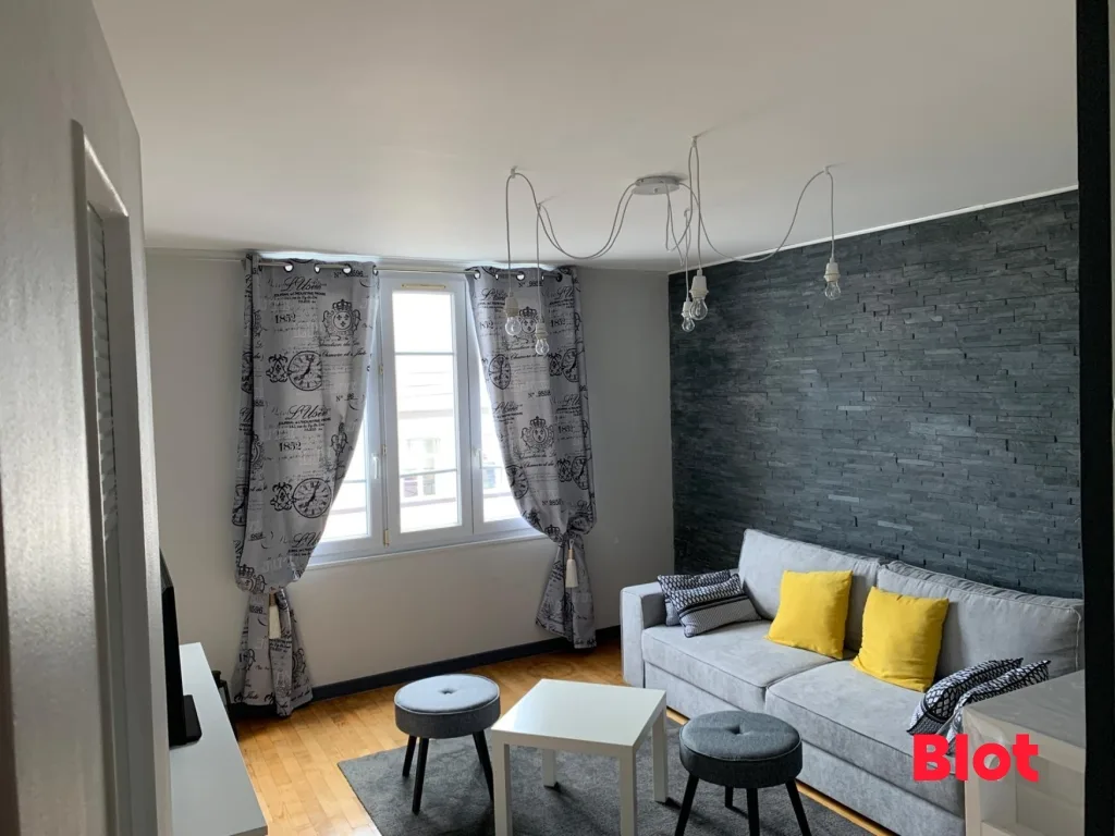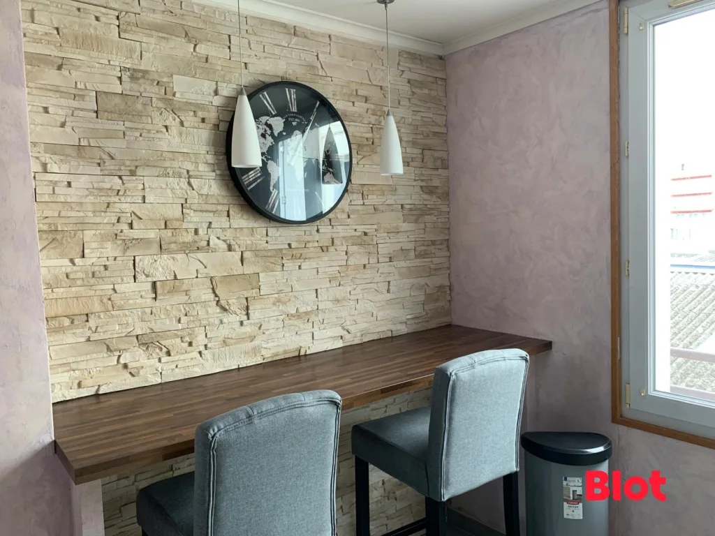 L'appartement se compose d'une pièce de vie lumineuse, au style contemporain, mise en valeur par un mur en parement sombre et une décoration moderne. L'espace salon, chaleureux et bien agencé, bénéficie d'une belle luminosité naturelle grâce à une large fenêtre habillée de rideaux. La hauteur sous plafond et les volumes bien pensés offrent une atmosphère conviviale et accueillante.