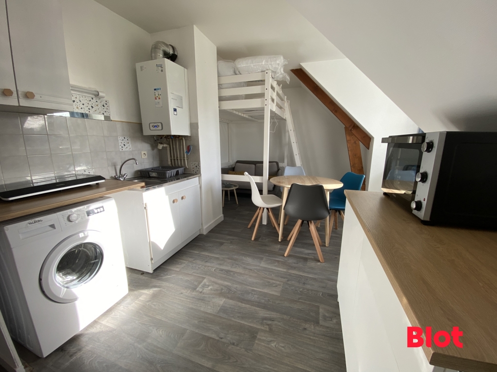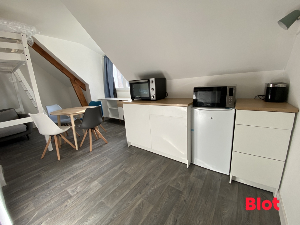 L'appartement se compose d'une pièce de vie avec sa cuisine aménagée et équipée, d'une entrée, d'un WC et d'une salle d'eau avec douche. Mobilier complet : plaques induction, réfrigérateur, four, micro-ondes, lave-linge, canapé, lit mezzanine, table et chaises, etc...