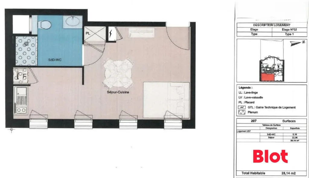 Cet appartement de type 1, situé au 2ème étage, de 28,14 m² est composé d'un séjour avec cuisine aménagée/semi-équipée ouverte de 22.96m², d'une salle d'eau avec WC.
