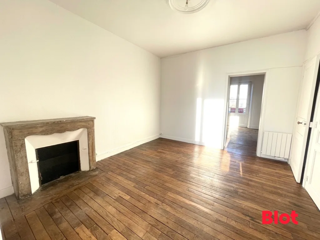 La pièce de vie séduit instantanément par son parquet d'origine et sa cheminée, véritables éléments de caractère. L'espace est lumineux et chaleureux, idéal pour créer un lieu de vie convivial.