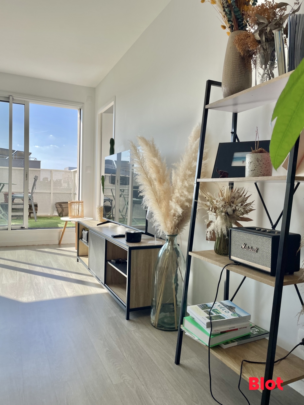 Il se compose d'une entrée avec placard donnant sur un grand espace de vie de 34 m² avec cuisine aménagée équipée et un balcon exposé SUD OUEST.