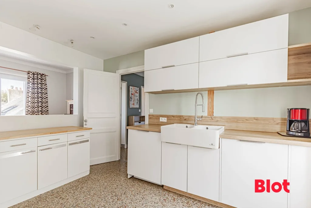 Vous découvrirez ensuite un salon lumineux attenant à la cuisine, séparés par un mur semi-ouvert avec passe-plat, offrant ainsi une belle communication entre les espaces tout en préservant leur indépendance.