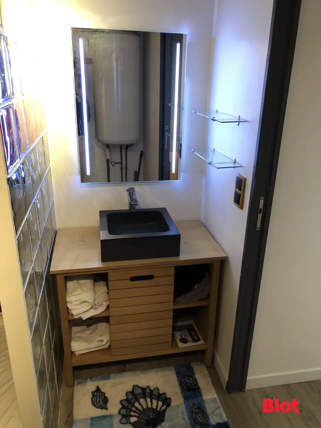 Il offre un bel espace de vie de 25 m2 avec coin cuisine équipée et aménagée. salle d'eau, wc. La chambre indépendante se trouve en mezzanine avec un espace dédié pour le bureau.