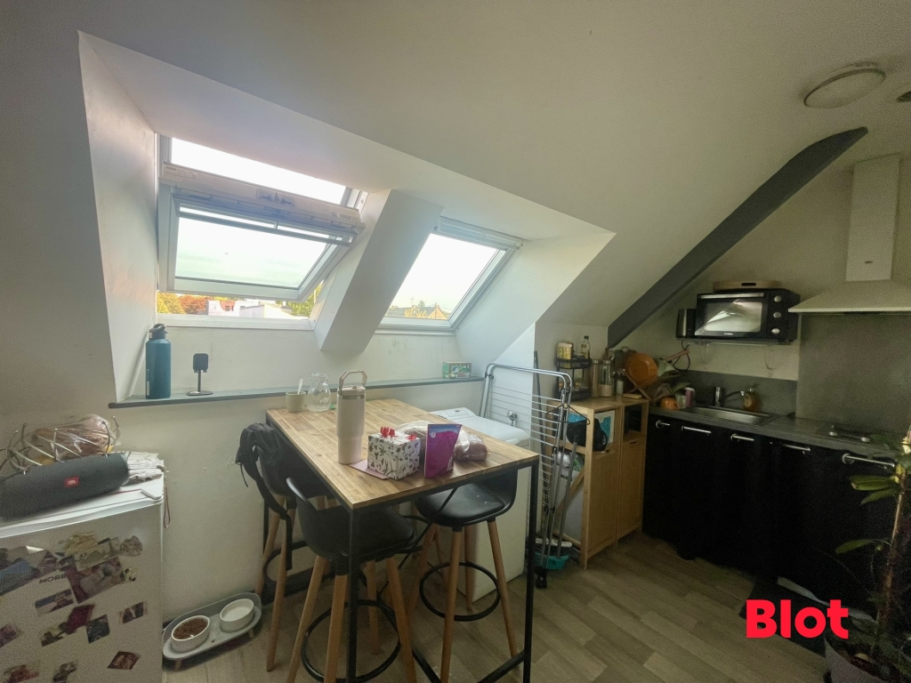 Un appartement T1 loué 320€ CC, comprenant : un séjour, une cuisine et une salle d'eau avec WC.
