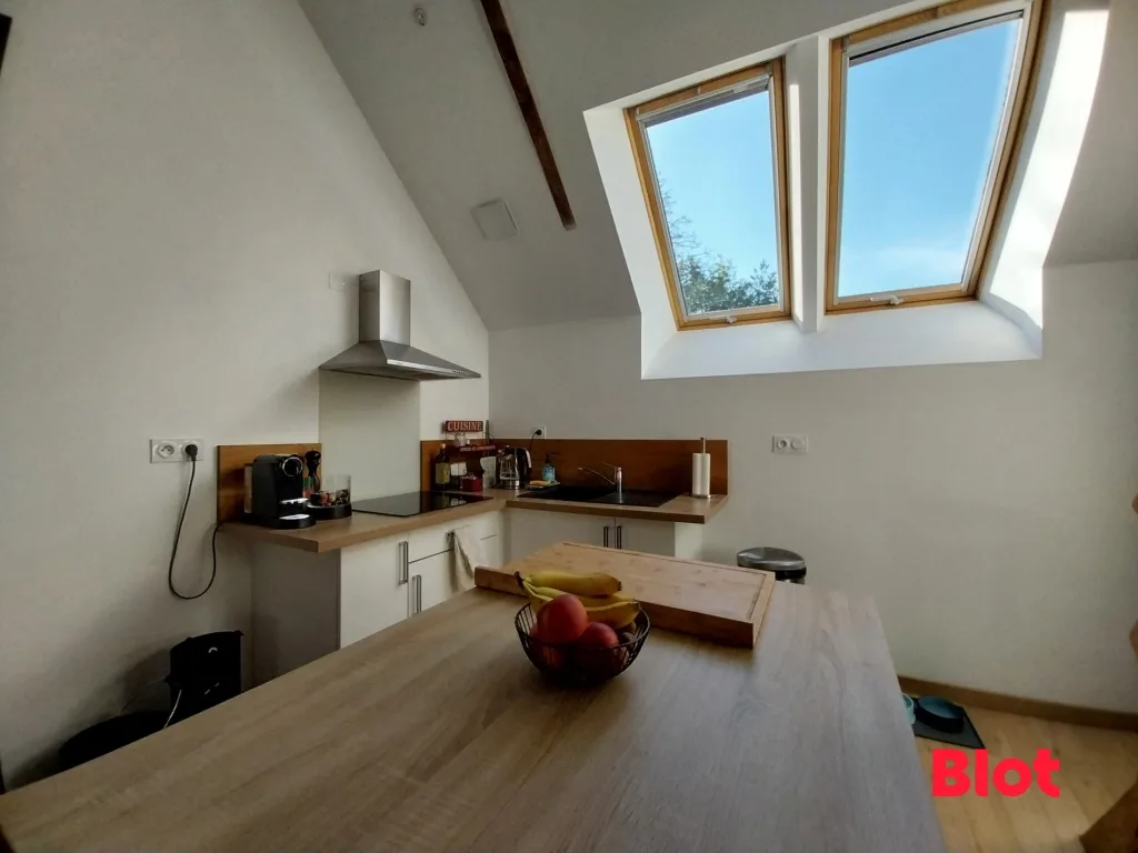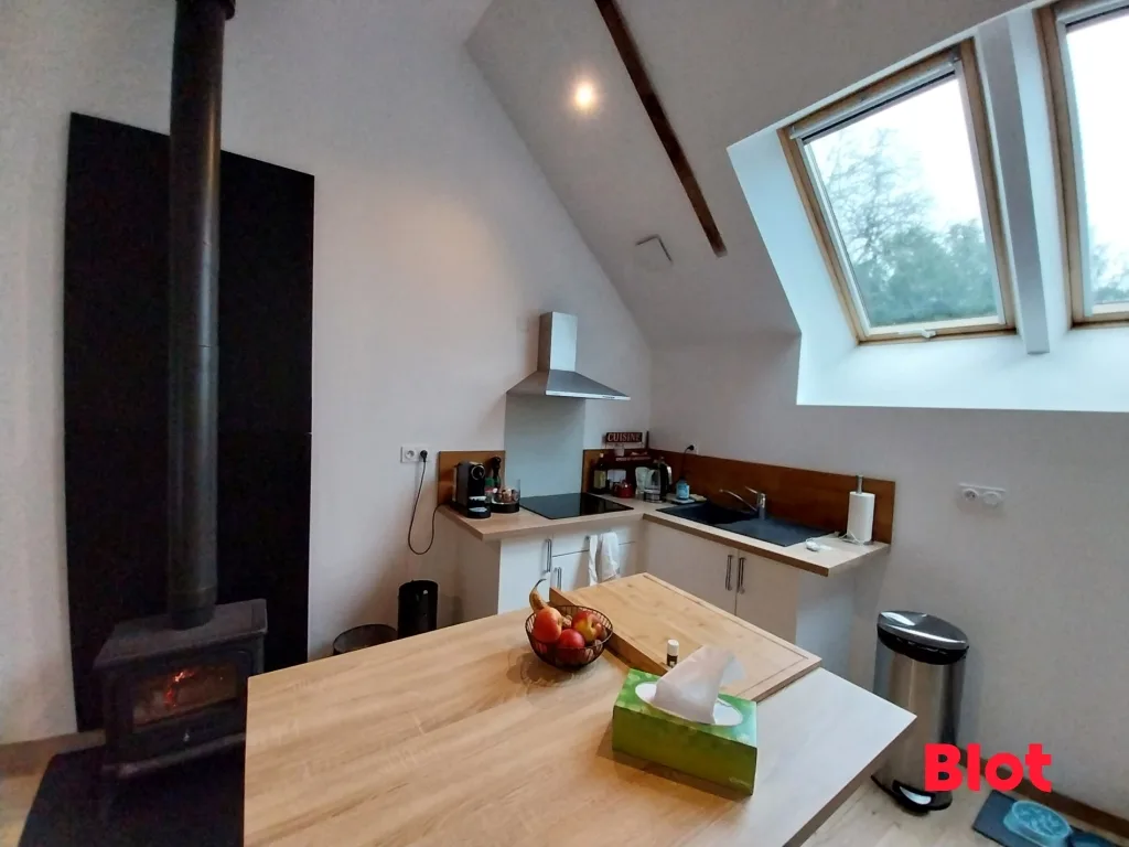 À l'étage: un palier dessert une belle pièce de vie spacieuse et lumineuse de part son exposition traversante avec un poêle à bois, une cuisine ouverte aménagée, une arrière-cuisine et une salle d'eau avec WC.