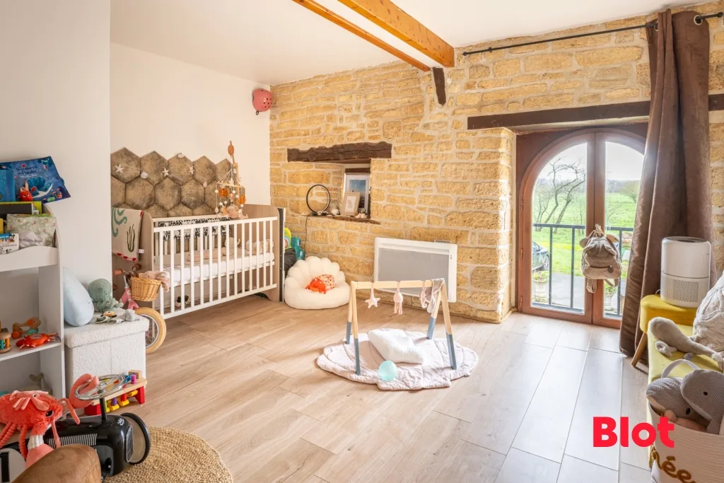 À l'étage, vous découvrirez quatre chambres : deux chambres confortables, une chambre avec salle de bains privative, ainsi qu'une belle suite parentale pleine de charme, dotée d'un dressing et d'une salle de bains avec WC. Des WC indépendants complètent ce niveau.