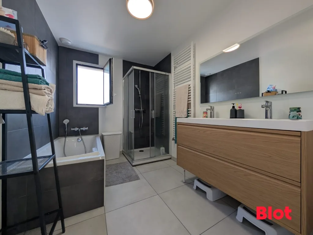 - Une salle de bains élégante et des rangements intégrés.