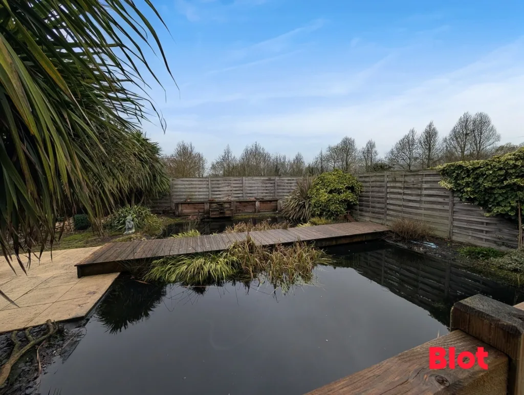 Implantée sur un magnifique terrain arboré de plus de 2 100 m², la propriété bénéficie d'un cadre privilégié, agrémenté d'une pièce d'eau, parfaite pour profiter de moments de détente en extérieur.