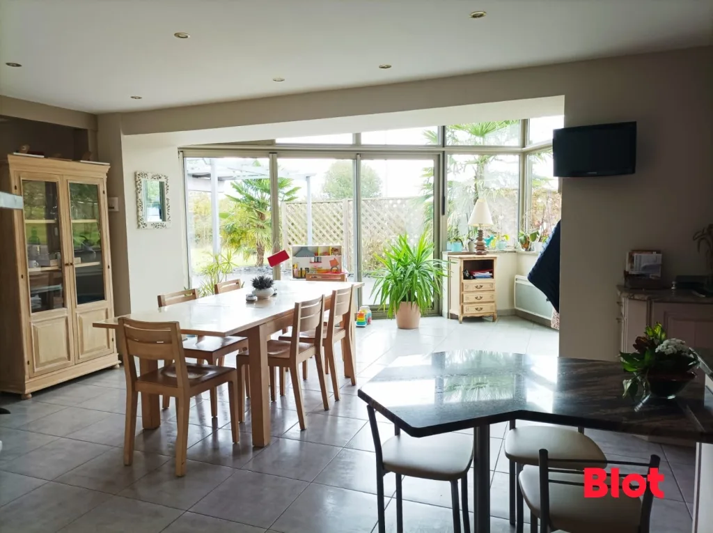 Au rez-de-chaussée, vous profiterez d'une véranda baignée de lumière, accueillant une salle à manger et une cuisine aménagée et équipée, ouverte sur un salon chaleureux avec poêle à pellets.