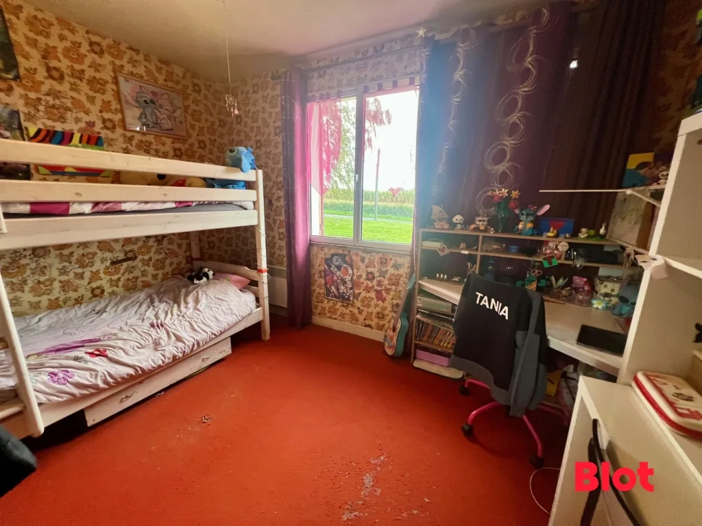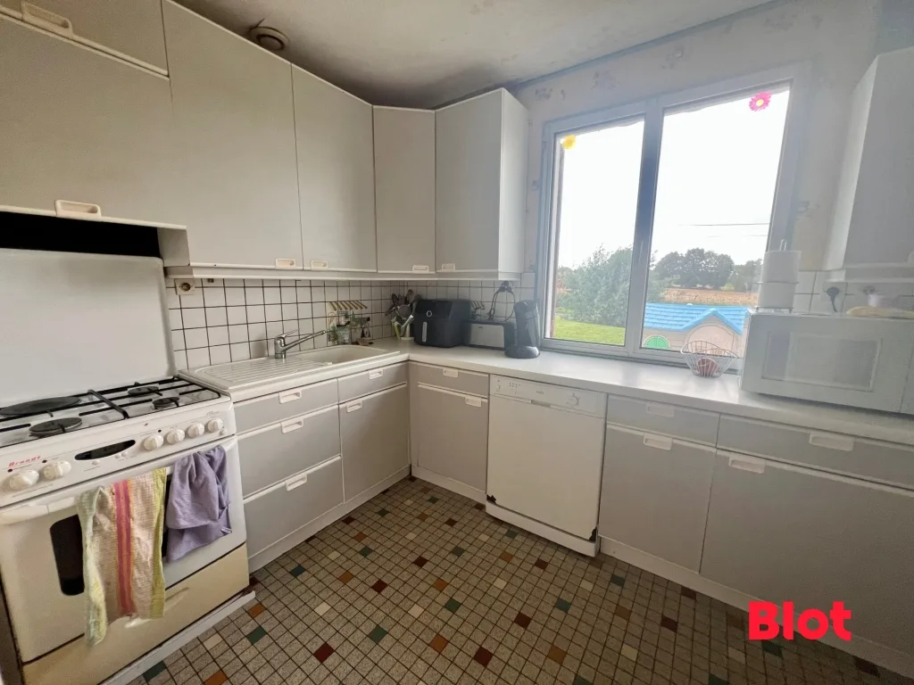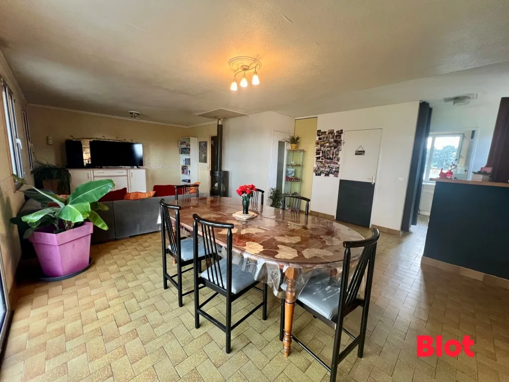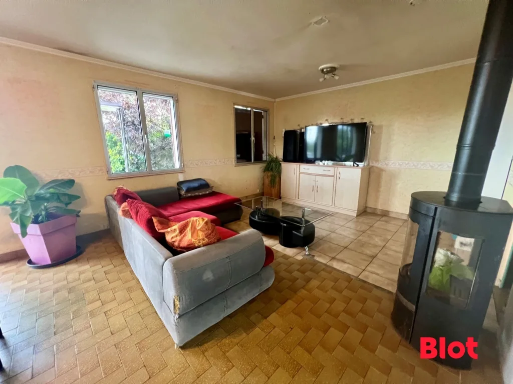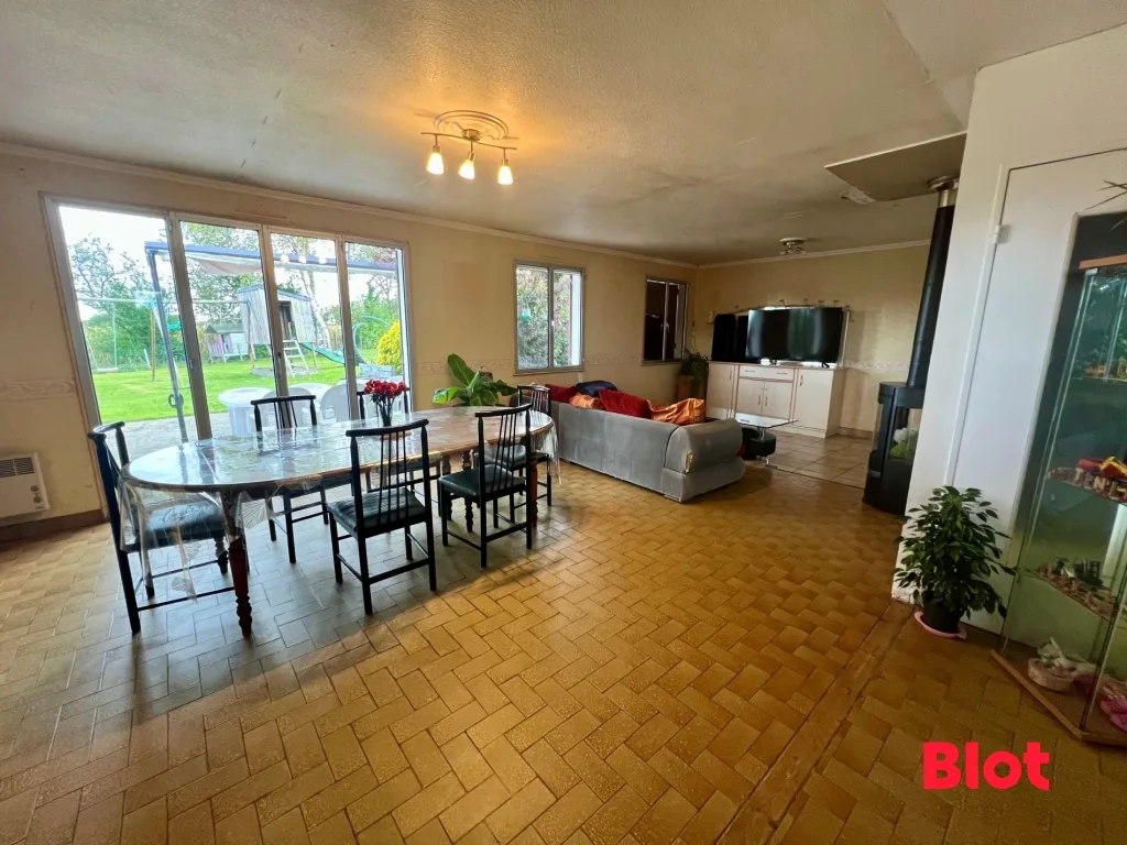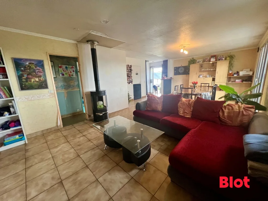 un vaste salon-séjour lumineux avec poêle à bois, 3 chambres spacieuses, cuisine et salle de bains à rafraîchir selon vos envies.