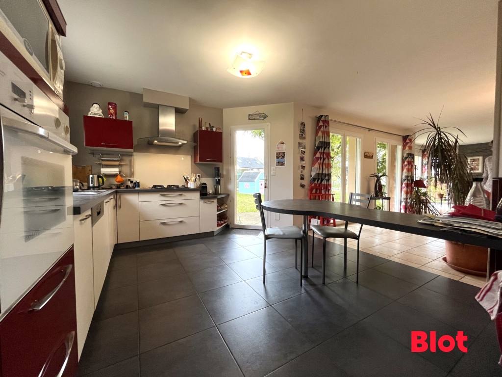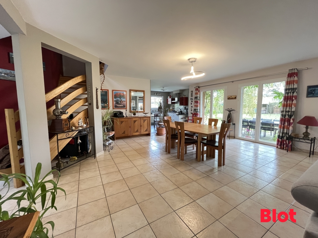 L'entrée dessert un bureau avec placard, un vaste salon-séjour avec cheminée insert, une cuisine ouverte aménagée et équipée suivi d'une buanderie.