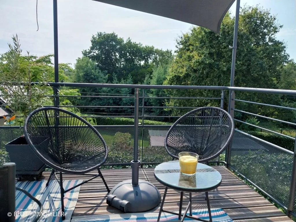 Erigée sur un sous-sol complet, elle propose une entrée donnant accès à une cuisine indépendante aménagée et équipée. La pièce de vie avec poêle à granulé est très lumineuse grâce à ses ouvertures et son accès à la terrasse offrant une vue dégagée sur la verdure environnante.