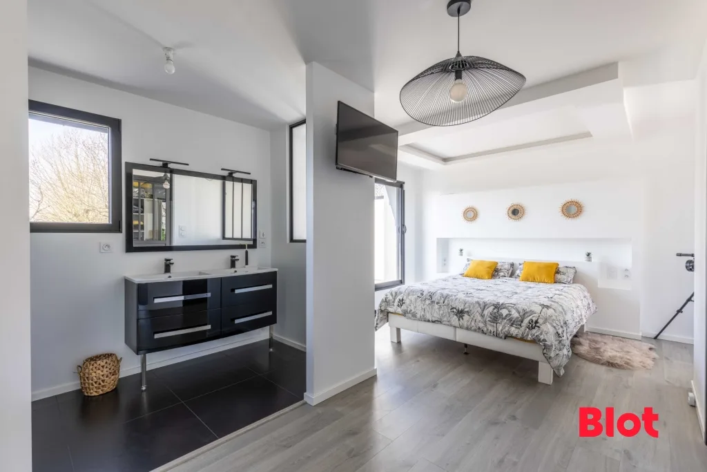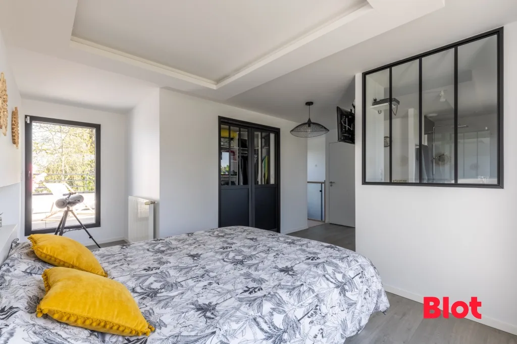 Au deuxième étage, vous découvrirez une superbe suite parentale composée d'une chambre, d'un dressing, d'une salle d'eau, ainsi que deux terrasses privatives, offrant un espace intime et privilégié.