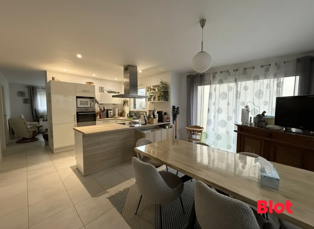 La pièce de vie se compose d'une salle à manger avec cuisine aménagée et équipée, semi-ouverte sur le salon avec accès au jardin.