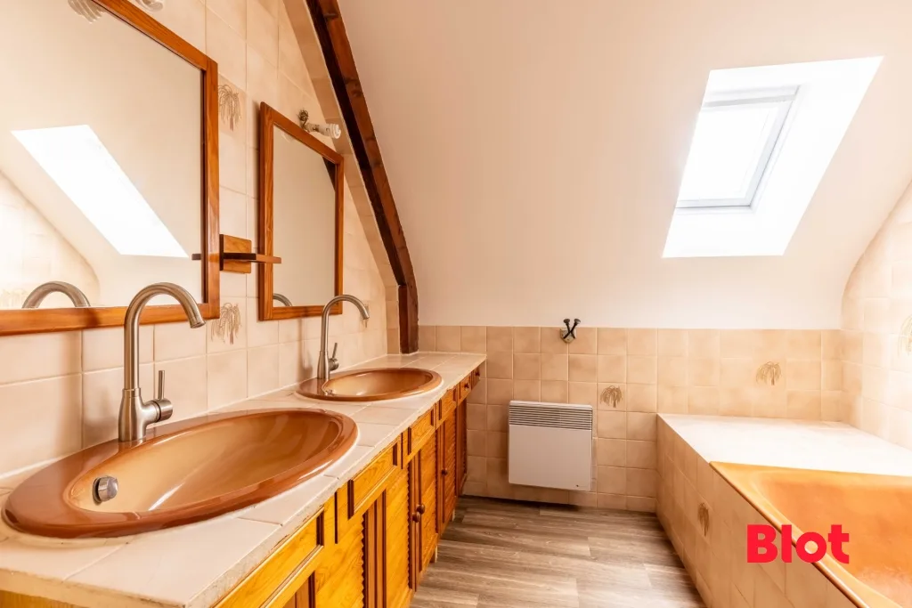 À l'étage, le palier dessert trois chambres et un bureau, récemment rénovés. La salle de bains, équipée d'une double vasque et d'une baignoire, ainsi qu'un wc séparé complètent l'ensemble.