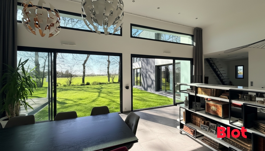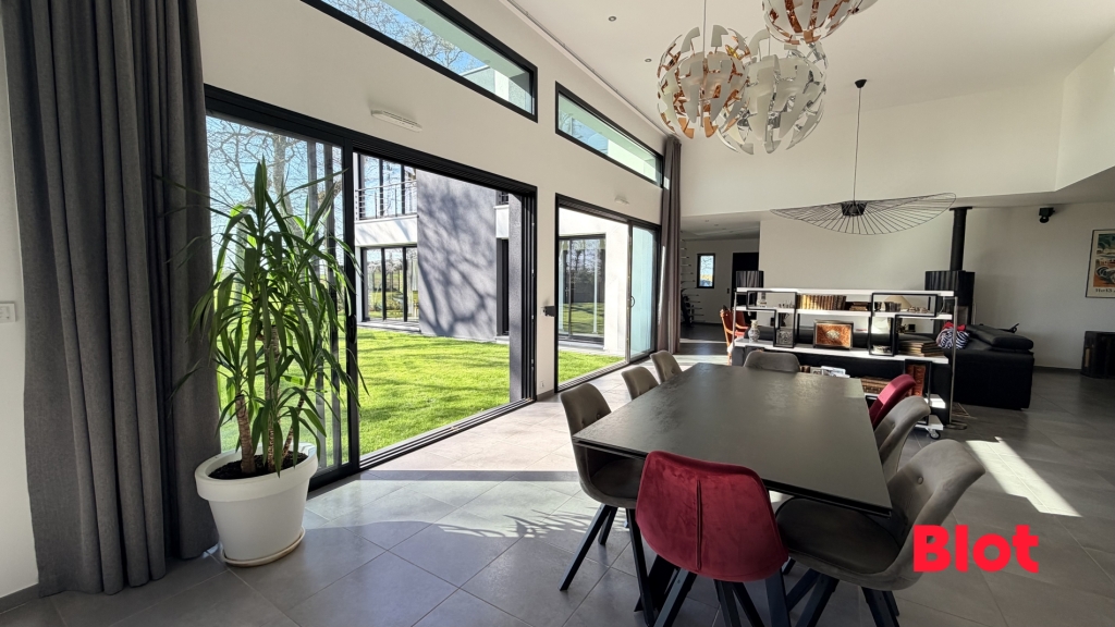 Les larges ouvertures prolongent naturellement les espaces de vie vers l'extérieur, créant une harmonie parfaite entre la maison et son jardin, véritable écrin de verdure.