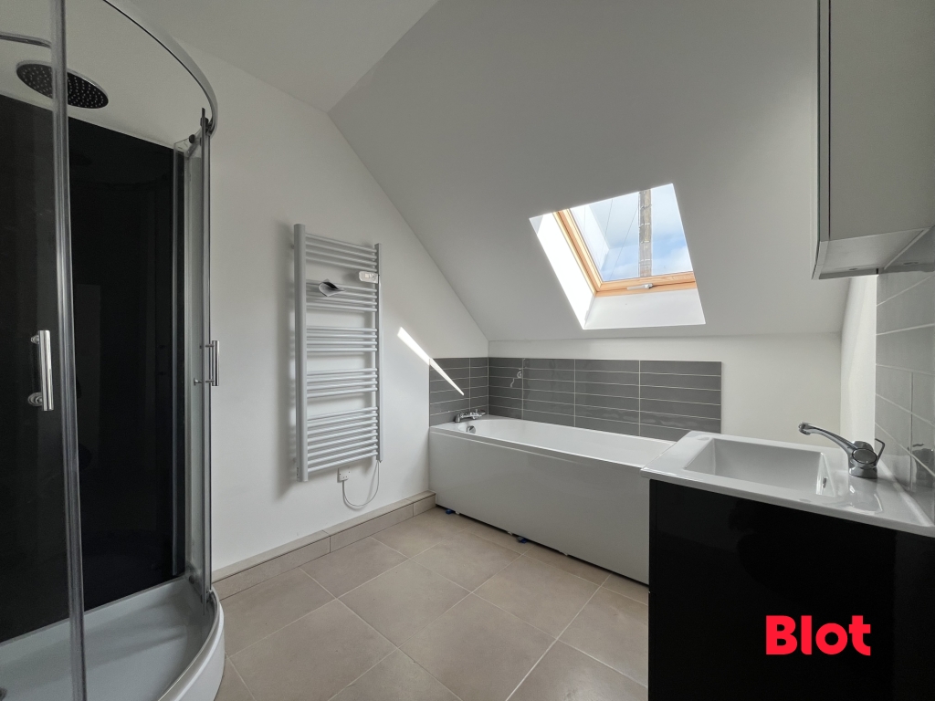 À l'étage, l'espace nuit propose trois belles chambres ainsi qu'une salle d'eau contemporaine avec baignoire, idéale pour vos moments de détente.
