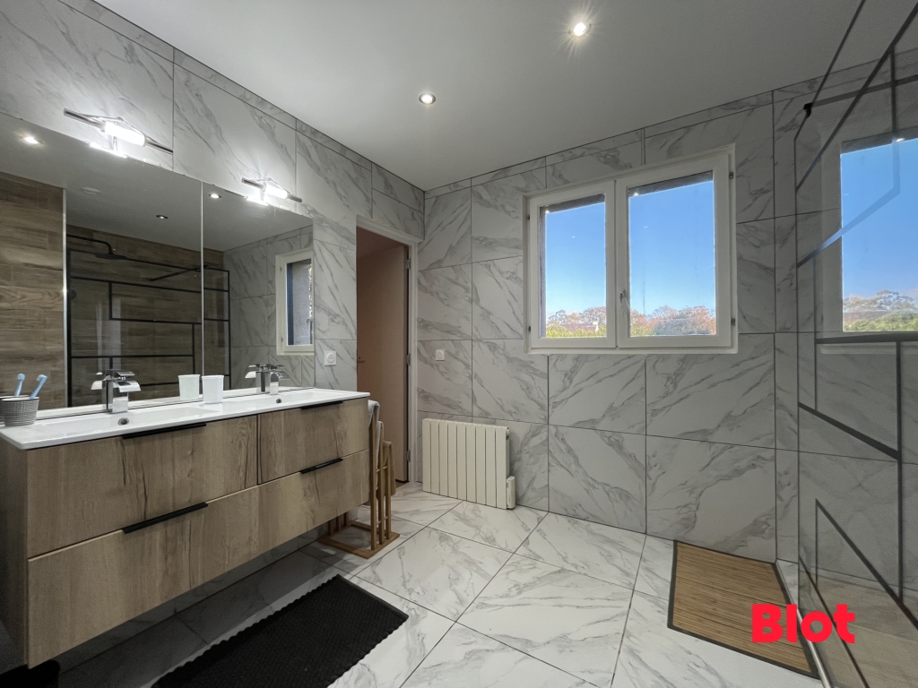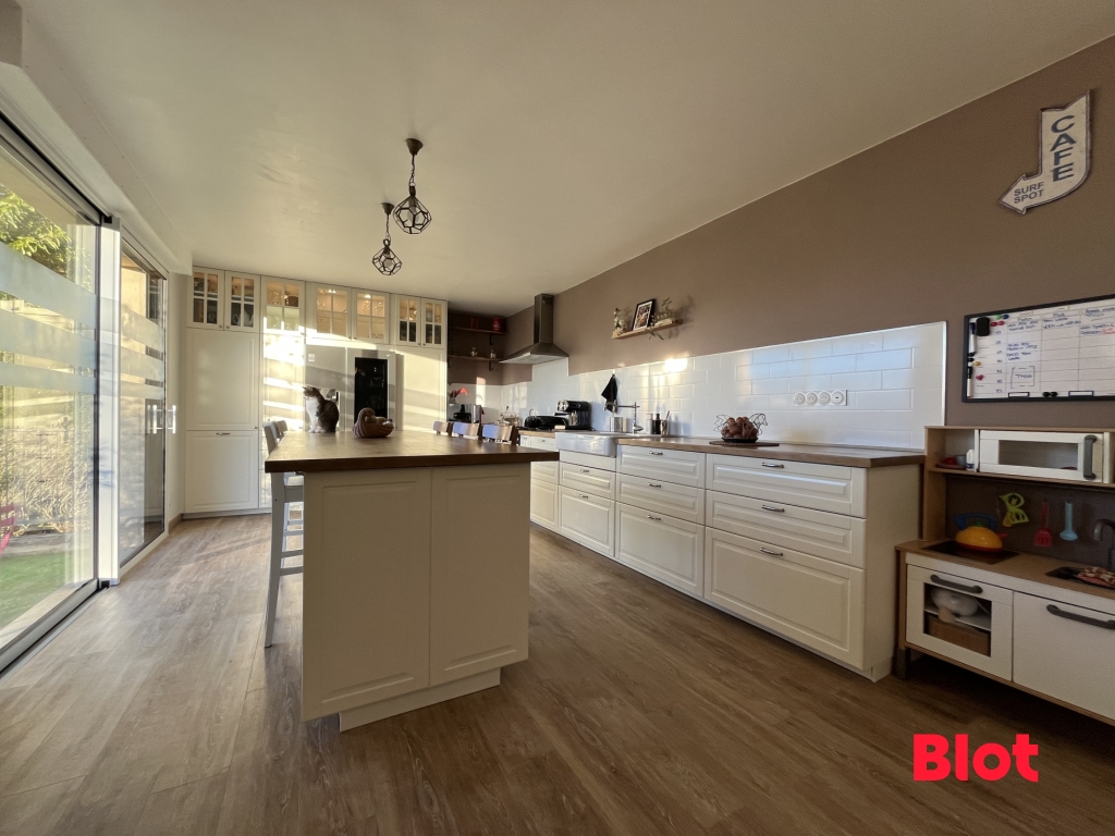 Au rez-de-chaussée, vous profiterez d'un superbe salon–séjour–cuisine ouvert de plus de 60 m², baigné de lumière. Le coin salon bénéficie d'une belle hauteur sous plafond, créant une atmosphère chaleureuse et élégante, renforcée par une cheminée, idéale pour les soirées d'hiver. La cuisine, rénovée en 2022, allie modernité et fonctionnalité pour partager de vrais moments de convivialité. Le rez-de-chaussée accueille également une chambre de plain-pied, complétée par sa salle d'eau privative de qualité et son dressing.