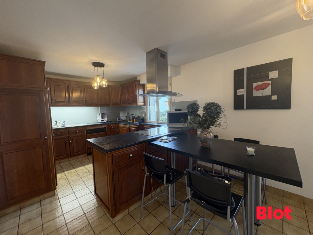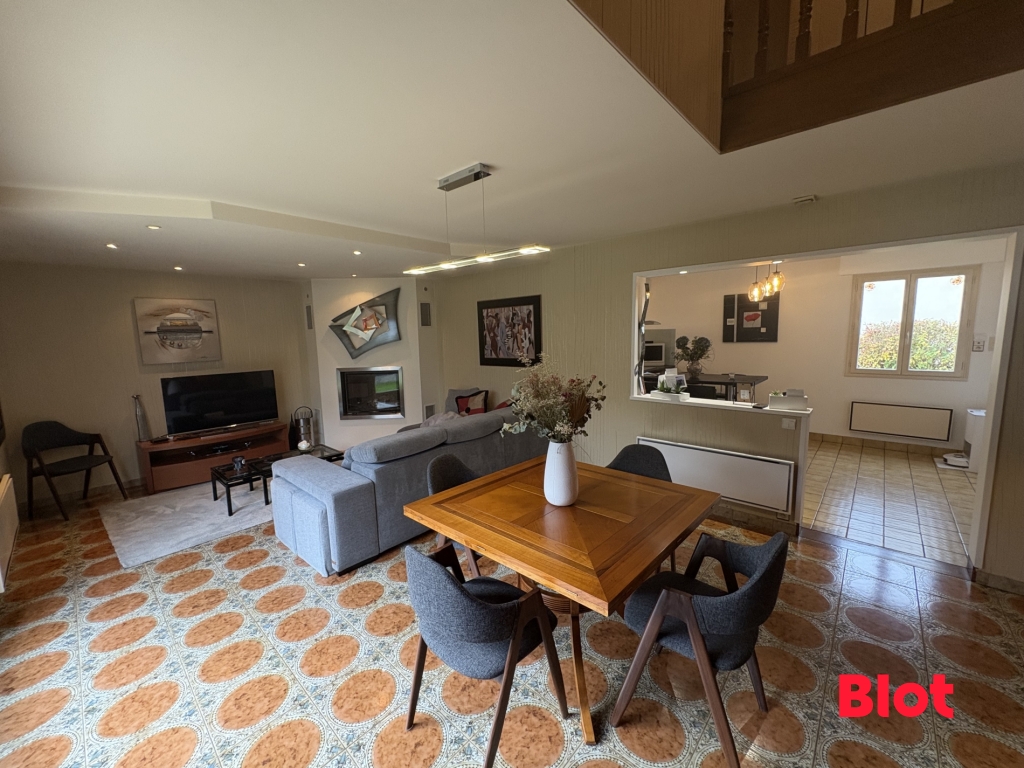 La cuisine, aménagée et équipée, est ouverte sur un vaste séjour lumineux, équipé d'une cheminée insert et donnant sur une terrasse exposée sud.