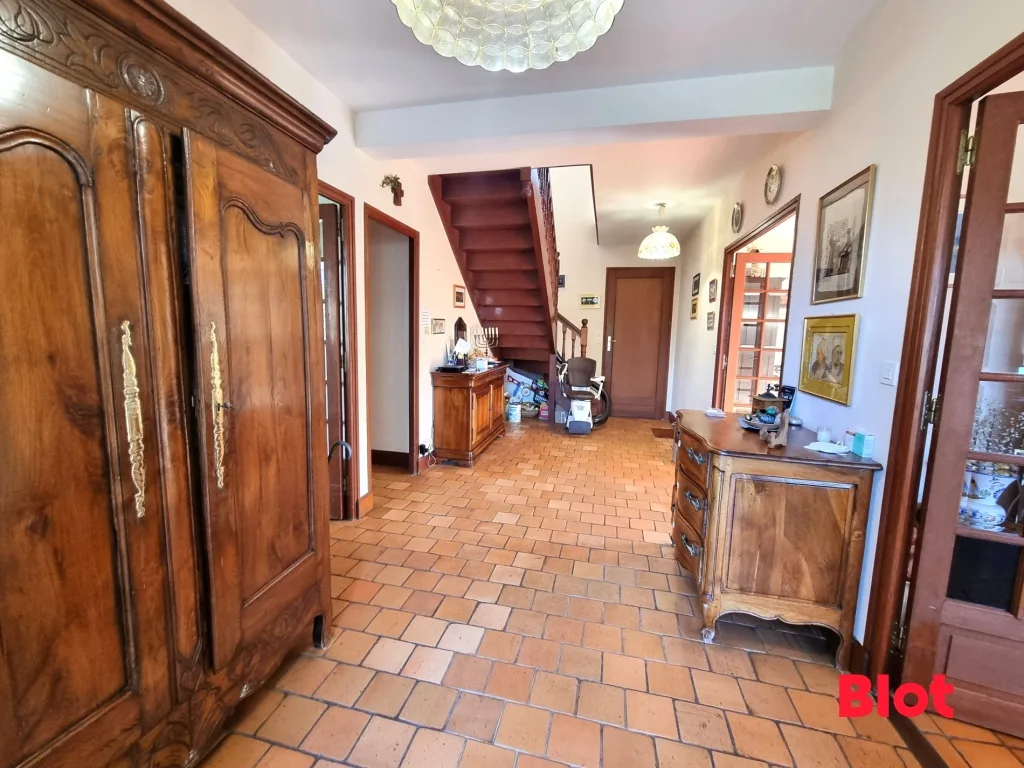 D'une surface de 227 m² habitables (245 m² au sol), la maison se compose au rez-de-chaussée: Une entrée accueillante, un salon chaleureux avec cheminée, un séjour spacieux, une cuisine indépendante avec arrière-cuisine et buanderie.