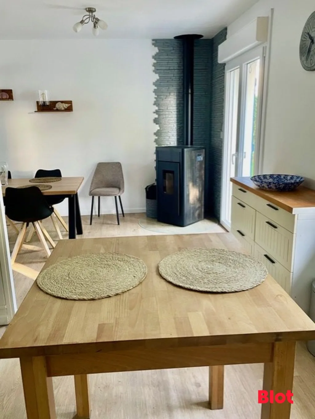 Dès l'entrée, agrémentée d'un vaste placard, le ton est donné : fonctionnalité, douceur et modernité. La belle pièce de vie, baignée de lumière, s'organise autour d'un poêle à granulés qui crée une atmosphère chaleureuse. La cuisine ouverte, aménagée et équipée, prolonge naturellement l'espace et invite à la convivialité.
