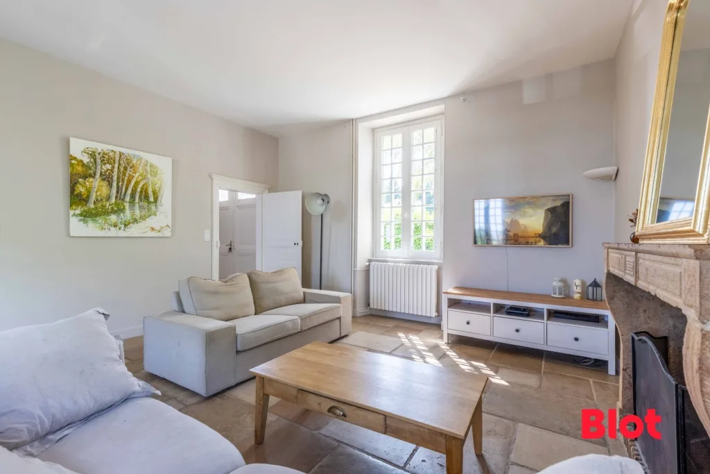 Le salon, habillé d'un carrelage en grès, est réchauffé par une cheminée à foyer ouvert, créant une ambiance chaleureuse. La salle à manger sur parquet massif et la grande cuisine familiale complètent un espace de vie convivial et fonctionnel.