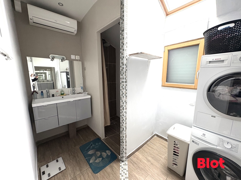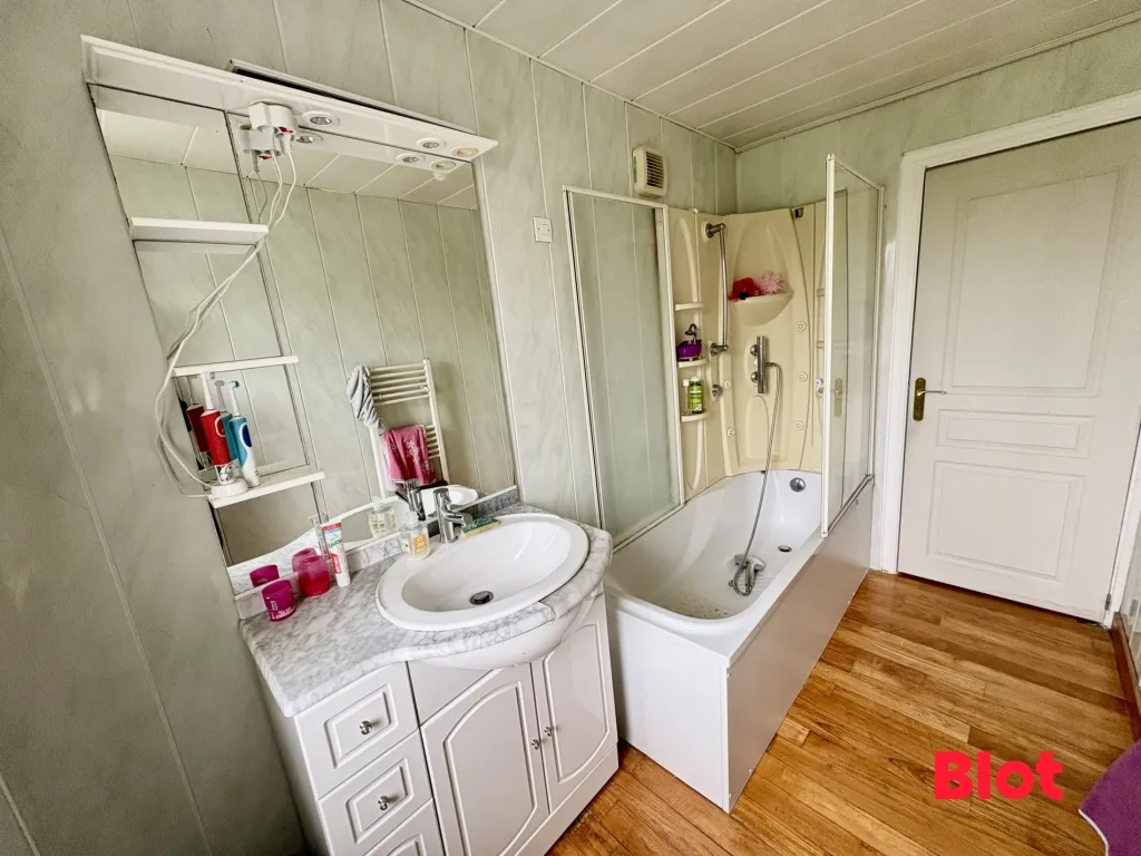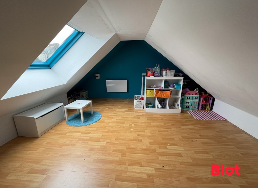 Le rez-de-chaussée comprend également une salle d'eau, des rangements bien pensés et un WC. À l'étage, le dégagement dessert deux chambres, une salle de bains, un WC indépendant, un bureau idéal pour le télétravail et une chambre sous combles.