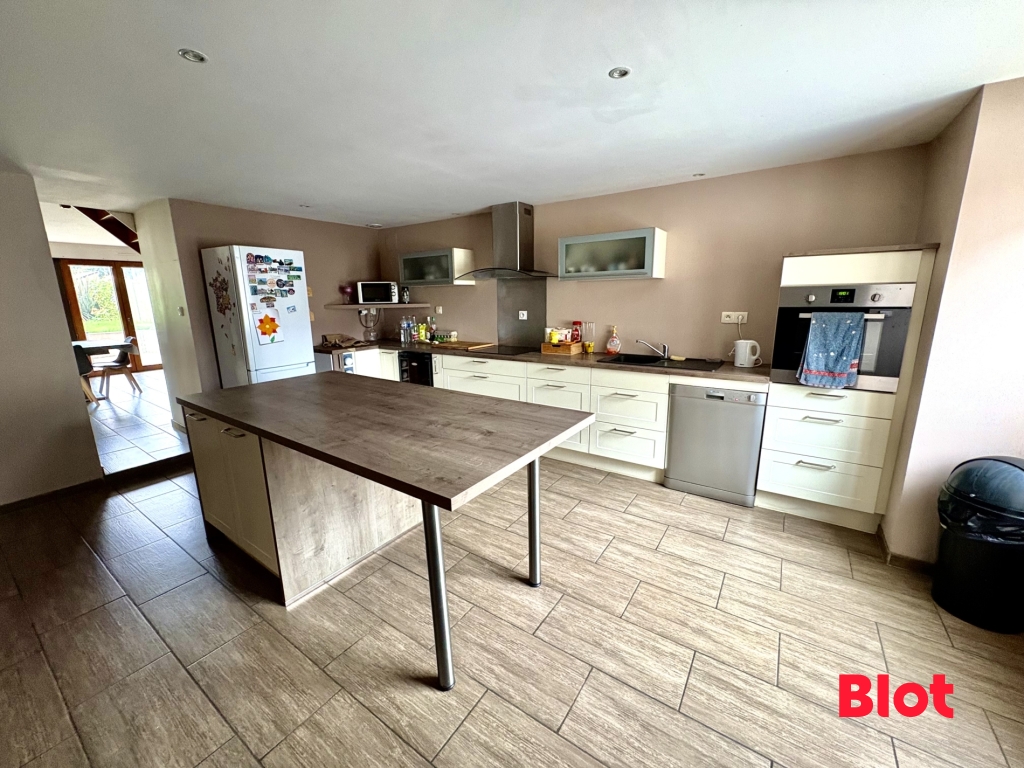 Dès l'entrée, vous serez séduit par un vaste salon-séjour de 37 m², véritable cœur de la maison : chaleureux et lumineux, il accueille un coin salon autour du poêle à granulés et un grand espace repas. Sa configuration ouverte sur la cuisine et ses larges ouvertures offrent une circulation fluide vers la terrasse et le jardin, et laissent une grande liberté d'aménagement (espace lecture, coin jeux, bureau ponctuel).