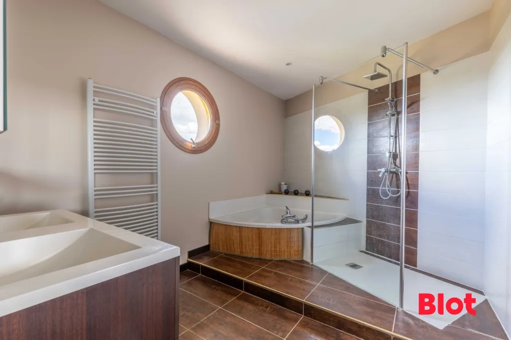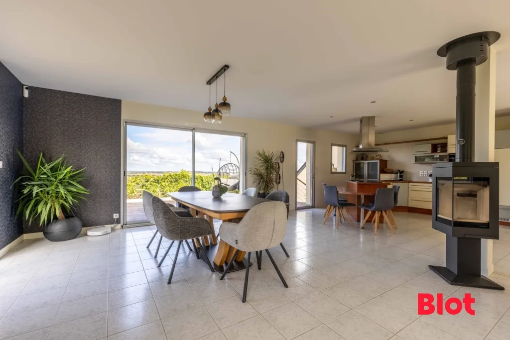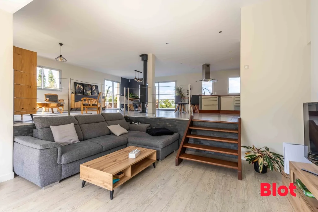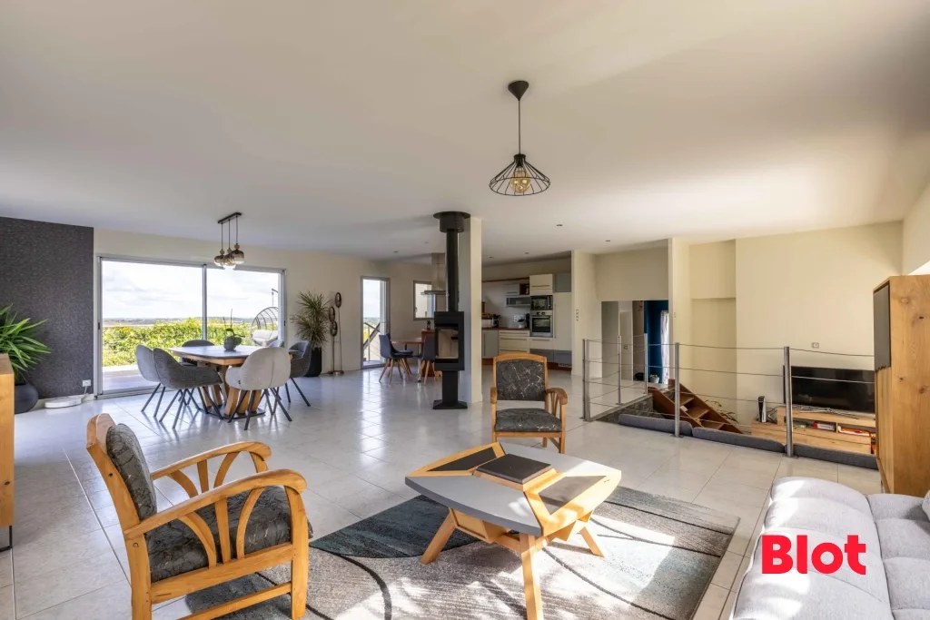 Au rez-de-chaussée, une entrée s'ouvre sur un vaste séjour lumineux de plus de 90 m² avec cuisine aménagée ouverte, prolongé par une terrasse offrant une vue dégagée. Une suite parentale avec dressing, salle de bain et accès direct au jardin complète ce niveau.