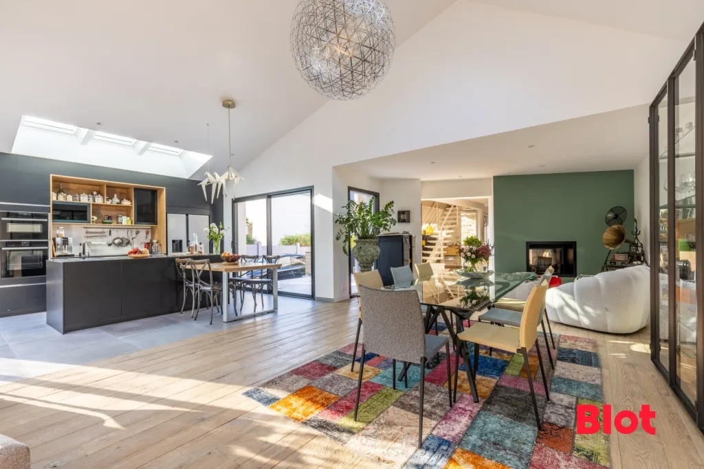 La pièce de vie principale séduit immédiatement par ses volumes généreux et son ambiance chaleureuse. Les larges baies vitrées et les puits de lumière inondent l'espace de soleil, offrant une parfaite continuité entre l'intérieur et le jardin. Elle offre une salle à manger conviviale et un salon doté d'une cheminée design, idéal pour des soirées cosy.