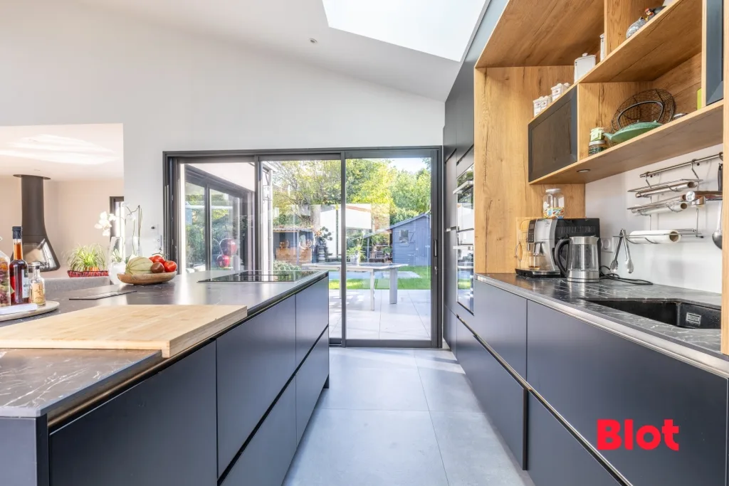 La cuisine moderne, spacieuse et entièrement équipée, bénéficie de nombreux rangements intégrés, d'un plan de travail élégant et d'une vue directe sur le jardin.
