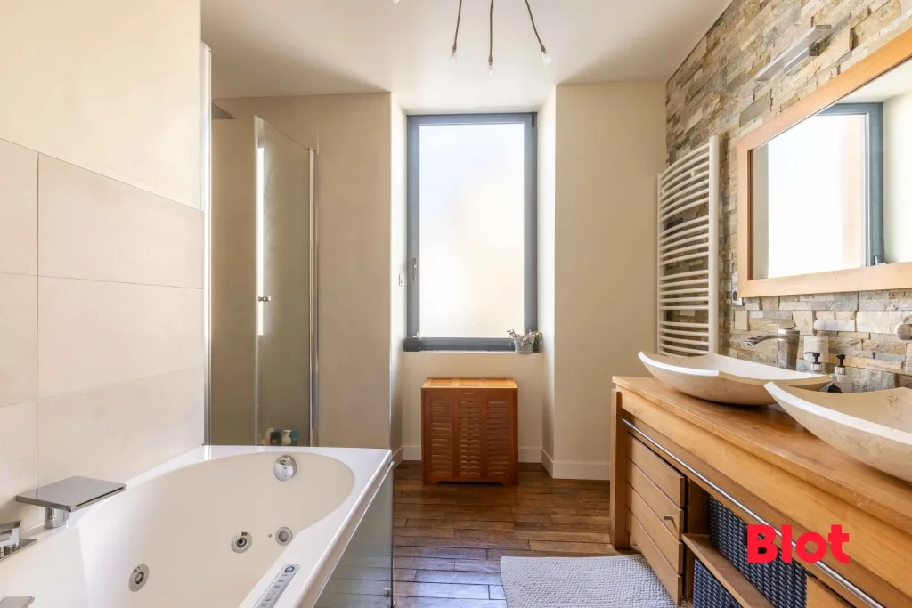Trois salles d'eau modernes complètent l'ensemble, dont une avec une baignoire balnéo.