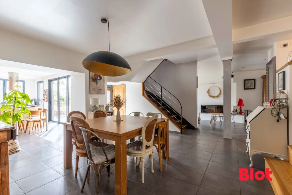 Le vaste salon-séjour équipé d'une cheminée insert et la cuisine contemporaine, véritable cœur de la maison, sublimé par de grandes ouvertures donnant sur la terrasse et créant une continuité fluide entre intérieur et extérieur.