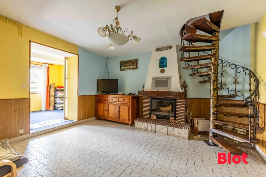 Au rez-de-chaussée vous trouverez une pièce de vie avec cheminée et une cuisine et toilettes.