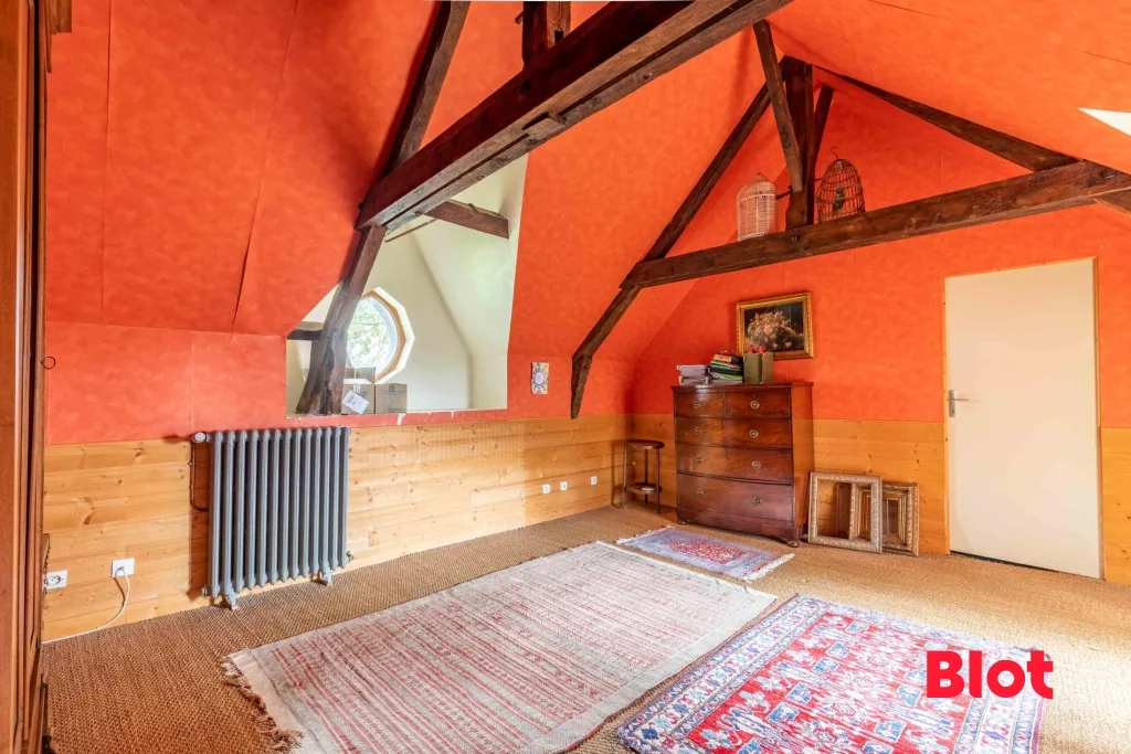 Un bel escalier en bois vous permet d'accéder au 1er niveau qui dessert deux chambres et une salle de bains, puis au 2ème étage qui comprend deux chambres dont une très grande avec un dressing. Pompe à chaleur de 2024.