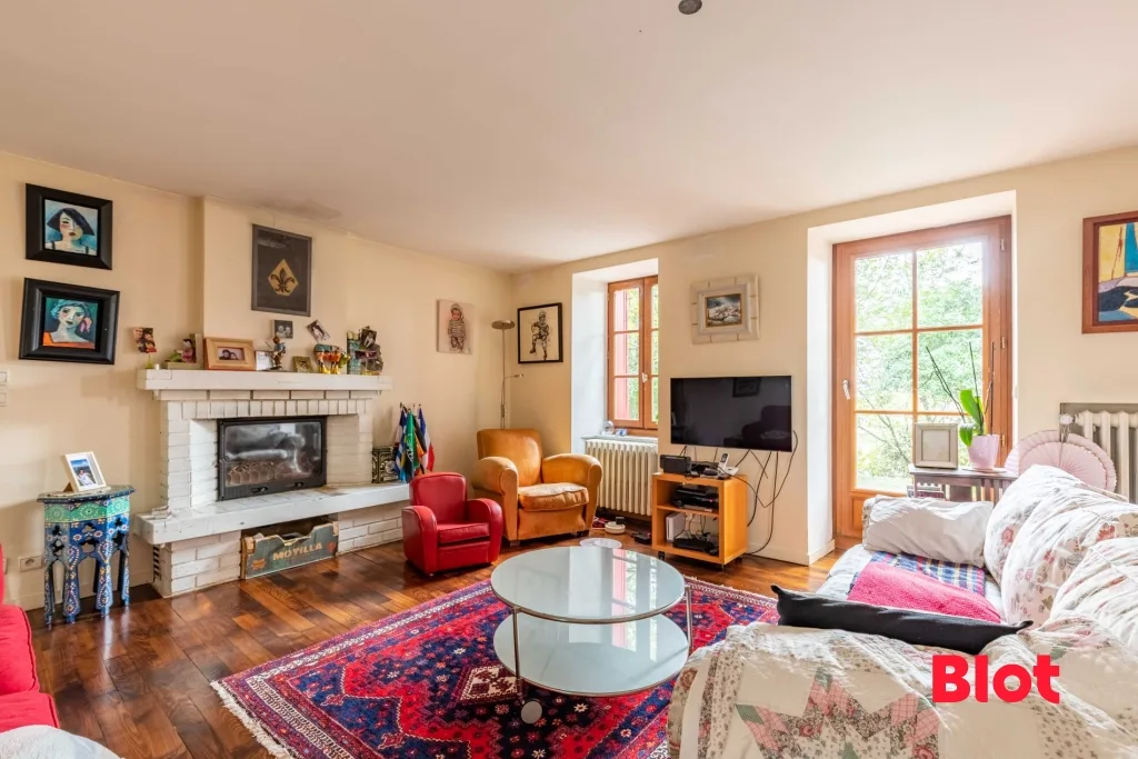 Une grande entrée avec placard, un grand salon-séjour sur parquet avec cheminée, une belle cuisine récente équipée et aménagée, un wc.