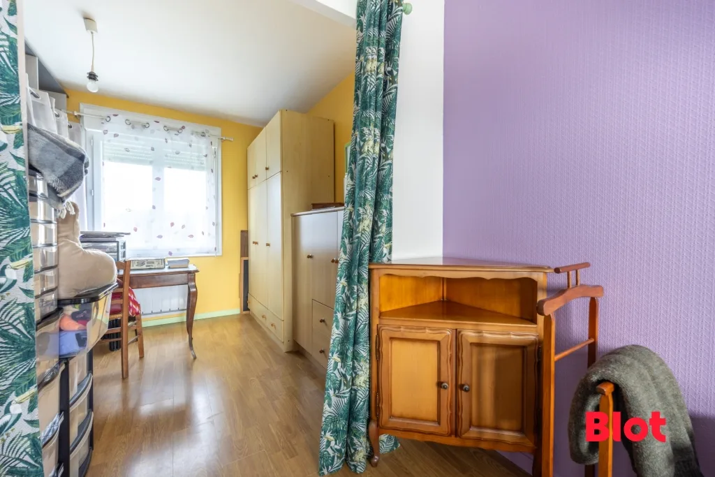 au rez-de-chaussée une entrée, un séjour-salle à manger, une cuisine fermée, un débarras et une belle chambre avec coin bureau, WC séparés et salle de bain.