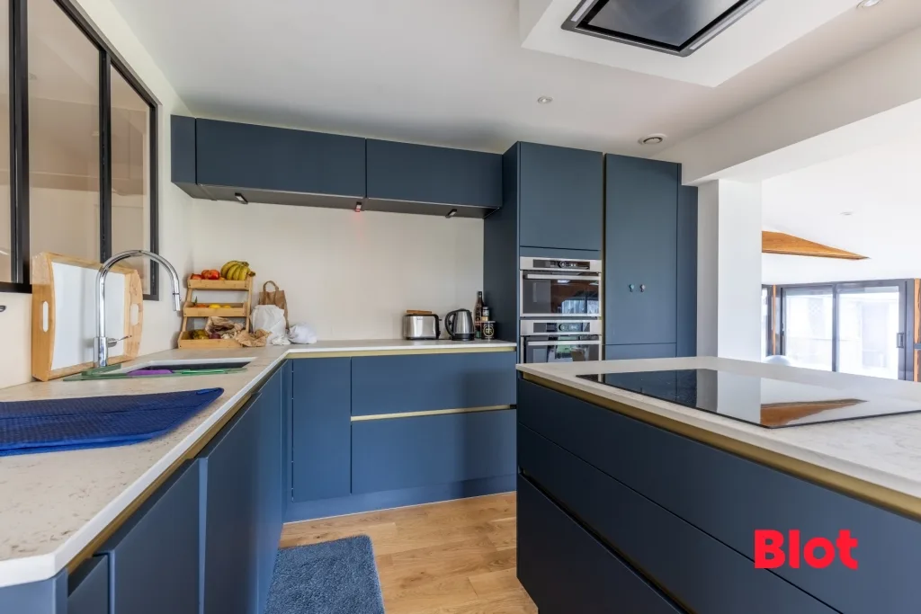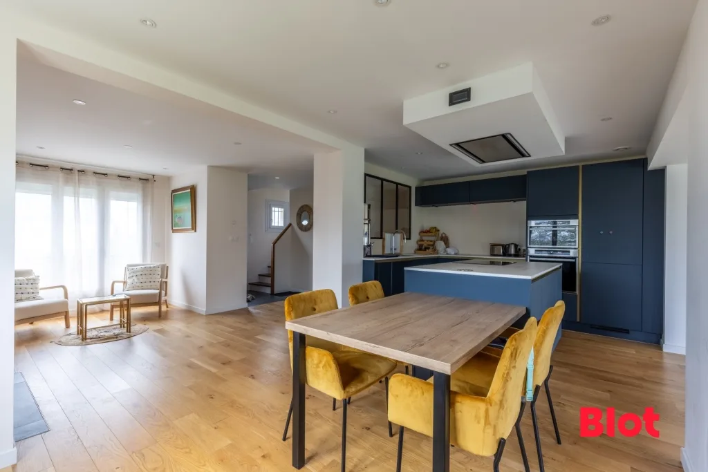 La cuisine ouverte, aménagée et équipée, sublimée par un plan de travail en pierre, s'harmonise parfaitement avec le vaste salon séjour baigné de lumière et donnant accès direct au jardin.